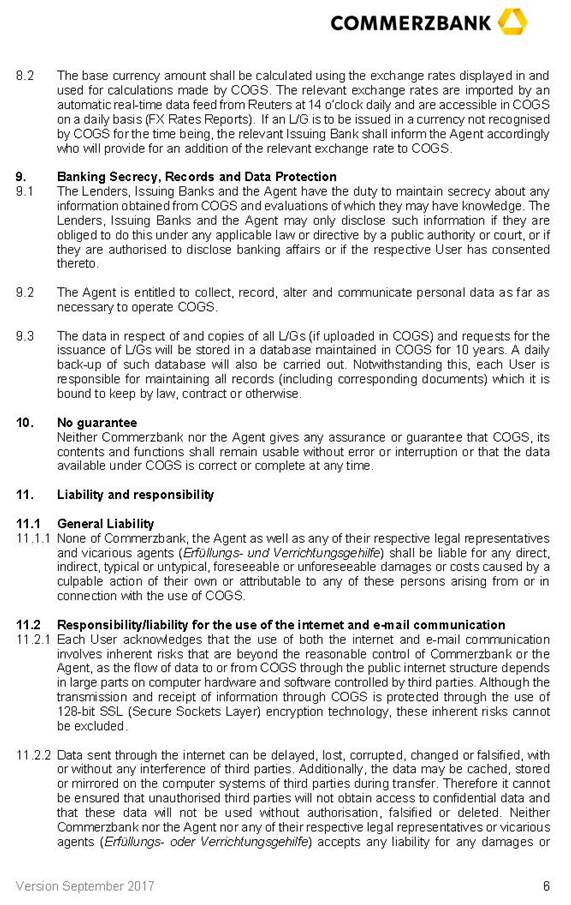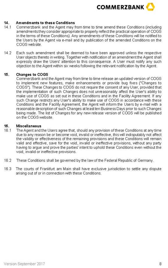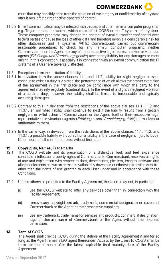 | (c) | For the purposes of paragraphs (a) to (c) only, the parties to this Agreement appoint each Recipient as their attorney (Empfangsvertreter) and expressly allow (gestatten) such Recipient to collect the signed signature page(s) from all and for all Parties to this Agreement. For the avoidance of doubt, no Recipient will have further duties connected with its position as Recipient. In particular, each Recipient may assume the conformity to the authentic original(s) of the signature page(s) transmitted to it by means of telecommunication, the genuineness of all signatures on the original signature page(s) and the signing authority of the signatories. |