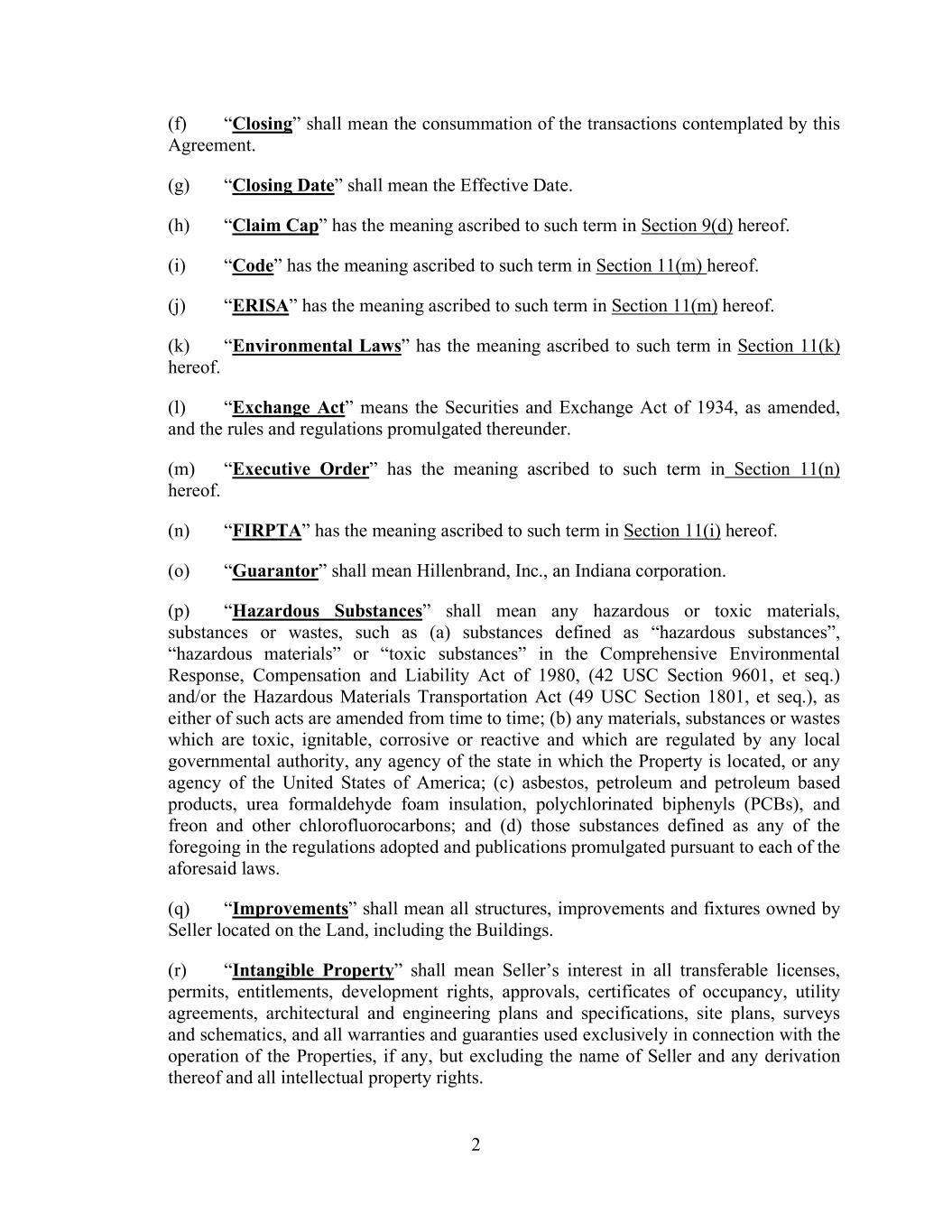 2 (f) “Closing” shall mean the consummation of the transactions contemplated by this Agreement. (g) “Closing Date” shall mean the Effective Date. (h) “Claim Cap” has the meaning ascribed to such term in Section 9(d) hereof. (i) “Code” has the meaning ascribed to such term in Section 11(m) hereof. (j) “ERISA” has the meaning ascribed to such term in Section 11(m) hereof. (k) “Environmental Laws” has the meaning ascribed to such term in Section 11(k) hereof. (l) “Exchange Act” means the Securities and Exchange Act of 1934, as amended, and the rules and regulations promulgated thereunder. (m) “Executive Order” has the meaning ascribed to such term in Section 11(n) hereof. (n) “FIRPTA” has the meaning ascribed to such term in Section 11(i) hereof. (o) “Guarantor” shall mean Hillenbrand, Inc., an Indiana corporation. (p) “Hazardous Substances” shall mean any hazardous or toxic materials, substances or wastes, such as (a) substances defined as “hazardous substances”, “hazardous materials” or “toxic substances” in the Comprehensive Environmental Response, Compensation and Liability Act of 1980, (42 USC Section 9601, et seq.) and/or the Hazardous Materials Transportation Act (49 USC Section 1801, et seq.), as either of such acts are amended from time to time; (b) any materials, substances or wastes which are toxic, ignitable, corrosive or reactive and which are regulated by any local governmental authority, any agency of the state in which the Property is located, or any agency of the United States of America; (c) asbestos, petroleum and petroleum based products, urea formaldehyde foam insulation, polychlorinated biphenyls (PCBs), and freon and other chlorofluorocarbons; and (d) those substances defined as any of the foregoing in the regulations adopted and publications promulgated pursuant to each of the aforesaid laws. (q) “Improvements” shall mean all structures, improvements and fixtures owned by Seller located on the Land, including the Buildings. (r) “Intangible Property” shall mean Seller’s interest in all transferable licenses, permits, entitlements, development rights, approvals, certificates of occupancy, utility agreements, architectural and engineering plans and specifications, site plans, surveys and schematics, and all warranties and guaranties used exclusively in connection with the operation of the Properties, if any, but excluding the name of Seller and any derivation thereof and all intellectual property rights.