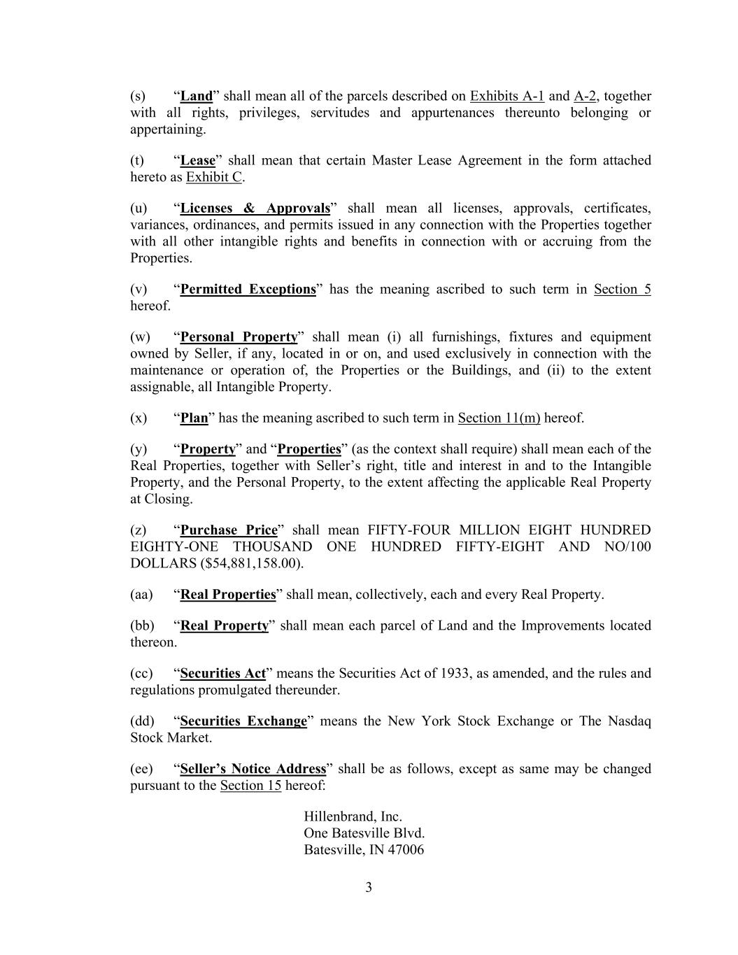3 (s) “Land” shall mean all of the parcels described on Exhibits A-1 and A-2, together with all rights, privileges, servitudes and appurtenances thereunto belonging or appertaining. (t) “Lease” shall mean that certain Master Lease Agreement in the form attached hereto as Exhibit C. (u) “Licenses & Approvals” shall mean all licenses, approvals, certificates, variances, ordinances, and permits issued in any connection with the Properties together with all other intangible rights and benefits in connection with or accruing from the Properties. (v) “Permitted Exceptions” has the meaning ascribed to such term in Section 5 hereof. (w) “Personal Property” shall mean (i) all furnishings, fixtures and equipment owned by Seller, if any, located in or on, and used exclusively in connection with the maintenance or operation of, the Properties or the Buildings, and (ii) to the extent assignable, all Intangible Property. (x) “Plan” has the meaning ascribed to such term in Section 11(m) hereof. (y) “Property” and “Properties” (as the context shall require) shall mean each of the Real Properties, together with Seller’s right, title and interest in and to the Intangible Property, and the Personal Property, to the extent affecting the applicable Real Property at Closing. (z) “Purchase Price” shall mean FIFTY-FOUR MILLION EIGHT HUNDRED EIGHTY-ONE THOUSAND ONE HUNDRED FIFTY-EIGHT AND NO/100 DOLLARS ($54,881,158.00). (aa) “Real Properties” shall mean, collectively, each and every Real Property. (bb) “Real Property” shall mean each parcel of Land and the Improvements located thereon. (cc) “Securities Act” means the Securities Act of 1933, as amended, and the rules and regulations promulgated thereunder. (dd) “Securities Exchange” means the New York Stock Exchange or The Nasdaq Stock Market. (ee) “Seller’s Notice Address” shall be as follows, except as same may be changed pursuant to the Section 15 hereof: Hillenbrand, Inc. One Batesville Blvd. Batesville, IN 47006