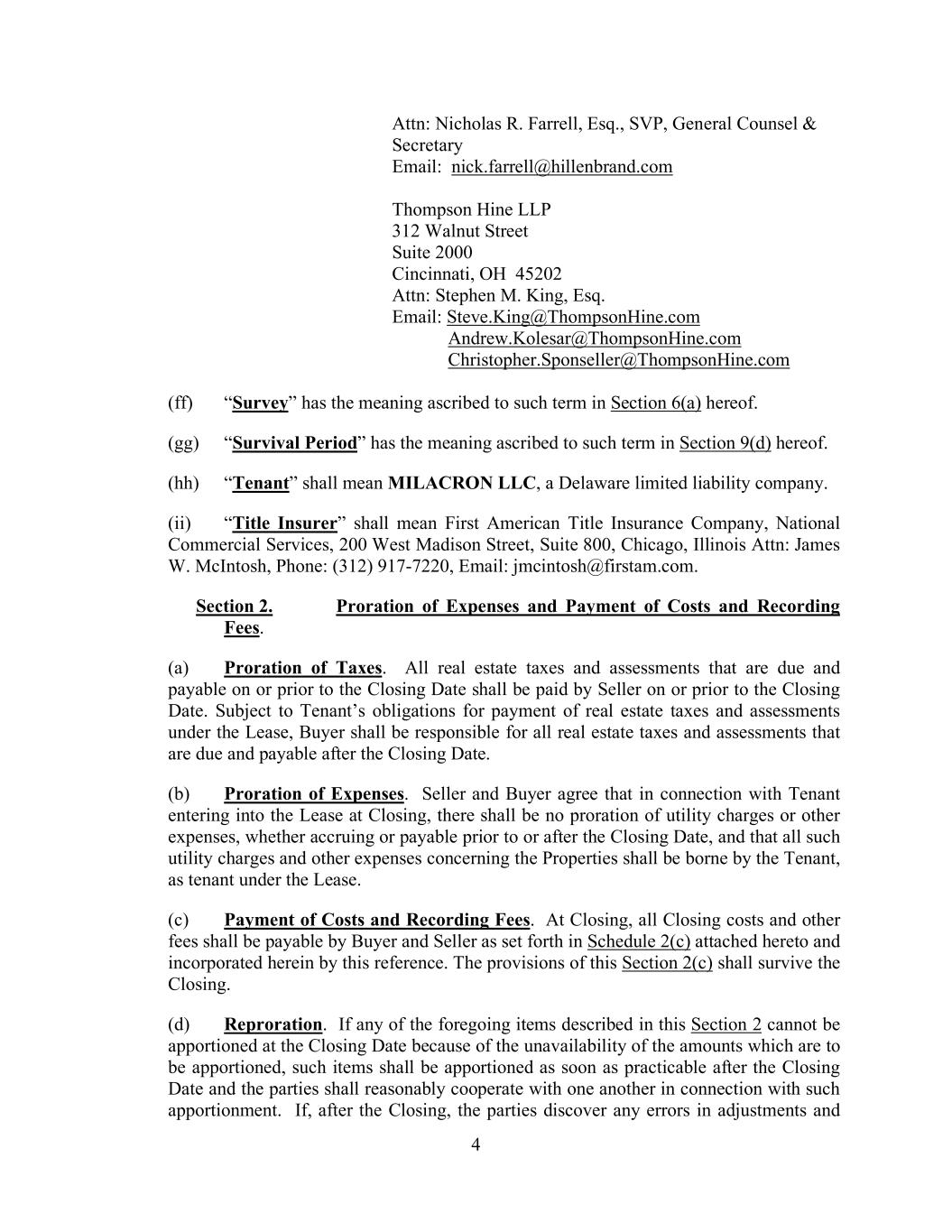 4 Attn: Nicholas R. Farrell, Esq., SVP, General Counsel & Secretary Email: nick.farrell@hillenbrand.com Thompson Hine LLP 312 Walnut Street Suite 2000 Cincinnati, OH 45202 Attn: Stephen M. King, Esq. Email: Steve.King@ThompsonHine.com Andrew.Kolesar@ThompsonHine.com Christopher.Sponseller@ThompsonHine.com (ff) “Survey” has the meaning ascribed to such term in Section 6(a) hereof. (gg) “Survival Period” has the meaning ascribed to such term in Section 9(d) hereof. (hh) “Tenant” shall mean MILACRON LLC, a Delaware limited liability company. (ii) “Title Insurer” shall mean First American Title Insurance Company, National Commercial Services, 200 West Madison Street, Suite 800, Chicago, Illinois Attn: James W. McIntosh, Phone: (312) 917-7220, Email: jmcintosh@firstam.com. Section 2. Proration of Expenses and Payment of Costs and Recording Fees. (a) Proration of Taxes. All real estate taxes and assessments that are due and payable on or prior to the Closing Date shall be paid by Seller on or prior to the Closing Date. Subject to Tenant’s obligations for payment of real estate taxes and assessments under the Lease, Buyer shall be responsible for all real estate taxes and assessments that are due and payable after the Closing Date. (b) Proration of Expenses. Seller and Buyer agree that in connection with Tenant entering into the Lease at Closing, there shall be no proration of utility charges or other expenses, whether accruing or payable prior to or after the Closing Date, and that all such utility charges and other expenses concerning the Properties shall be borne by the Tenant, as tenant under the Lease. (c) Payment of Costs and Recording Fees. At Closing, all Closing costs and other fees shall be payable by Buyer and Seller as set forth in Schedule 2(c) attached hereto and incorporated herein by this reference. The provisions of this Section 2(c) shall survive the Closing. (d) Reproration. If any of the foregoing items described in this Section 2 cannot be apportioned at the Closing Date because of the unavailability of the amounts which are to be apportioned, such items shall be apportioned as soon as practicable after the Closing Date and the parties shall reasonably cooperate with one another in connection with such apportionment. If, after the Closing, the parties discover any errors in adjustments and