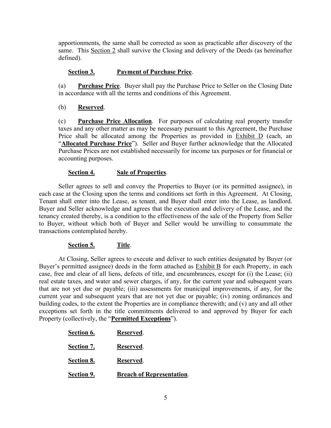5 apportionments, the same shall be corrected as soon as practicable after discovery of the same. This Section 2 shall survive the Closing and delivery of the Deeds (as hereinafter defined). Section 3. Payment of Purchase Price. (a) Purchase Price. Buyer shall pay the Purchase Price to Seller on the Closing Date in accordance with all the terms and conditions of this Agreement. (b) Reserved. (c) Purchase Price Allocation. For purposes of calculating real property transfer taxes and any other matter as may be necessary pursuant to this Agreement, the Purchase Price shall be allocated among the Properties as provided in Exhibit D (each, an “Allocated Purchase Price”). Seller and Buyer further acknowledge that the Allocated Purchase Prices are not established necessarily for income tax purposes or for financial or accounting purposes. Section 4. Sale of Properties. Seller agrees to sell and convey the Properties to Buyer (or its permitted assignee), in each case at the Closing upon the terms and conditions set forth in this Agreement. At Closing, Tenant shall enter into the Lease, as tenant, and Buyer shall enter into the Lease, as landlord. Buyer and Seller acknowledge and agrees that the execution and delivery of the Lease, and the tenancy created thereby, is a condition to the effectiveness of the sale of the Property from Seller to Buyer, without which both of Buyer and Seller would be unwilling to consummate the transactions contemplated hereby. Section 5. Title. At Closing, Seller agrees to execute and deliver to such entities designated by Buyer (or Buyer’s permitted assignee) deeds in the form attached as Exhibit B for each Property, in each case, free and clear of all liens, defects of title, and encumbrances, except for (i) the Lease; (ii) real estate taxes, and water and sewer charges, if any, for the current year and subsequent years that are not yet due or payable; (iii) assessments for municipal improvements, if any, for the current year and subsequent years that are not yet due or payable; (iv) zoning ordinances and building codes, to the extent the Properties are in compliance therewith; and (v) any and all other exceptions set forth in the title commitments delivered to and approved by Buyer for each Property (collectively, the “Permitted Exceptions”). Section 6. Reserved. Section 7. Reserved. Section 8. Reserved. Section 9. Breach of Representation.