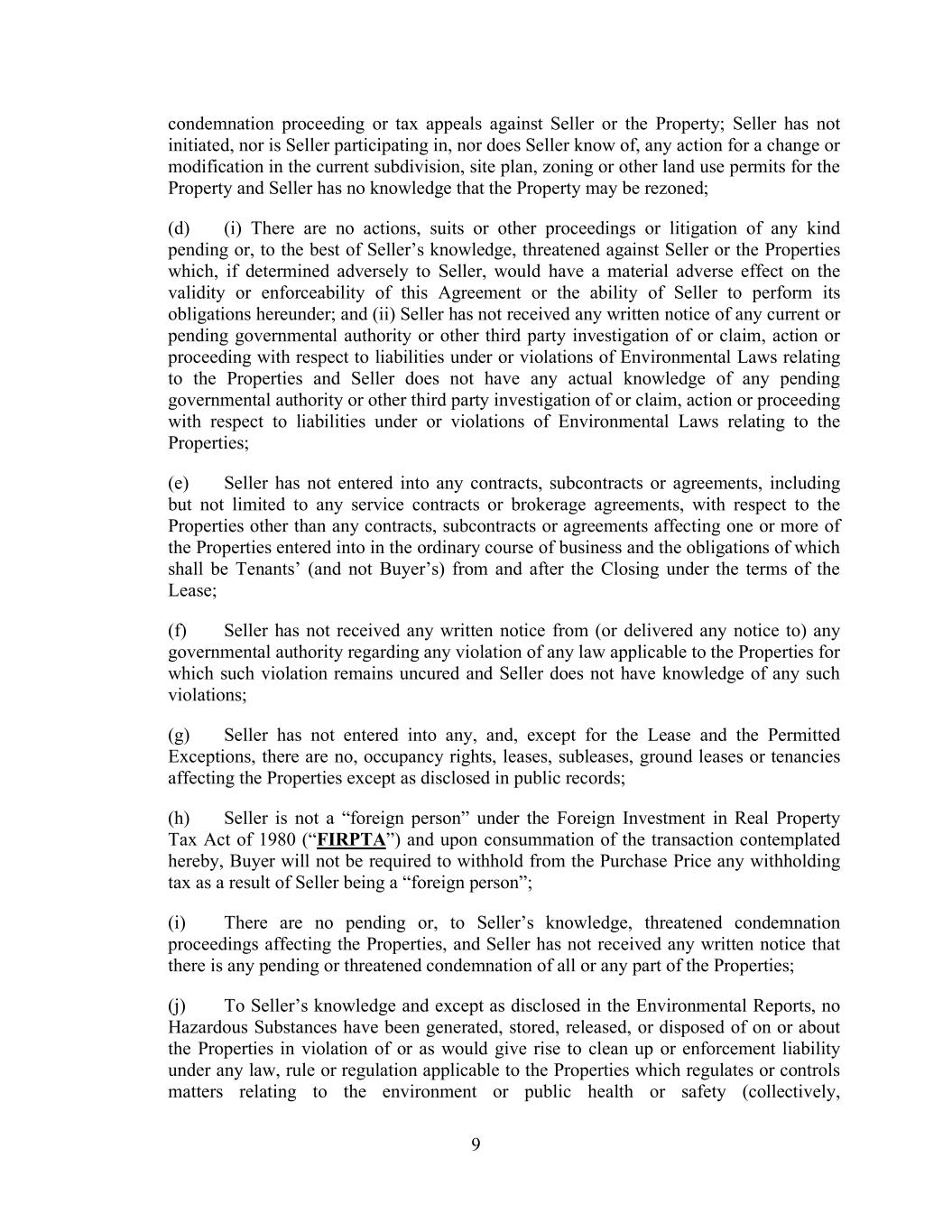 9 condemnation proceeding or tax appeals against Seller or the Property; Seller has not initiated, nor is Seller participating in, nor does Seller know of, any action for a change or modification in the current subdivision, site plan, zoning or other land use permits for the Property and Seller has no knowledge that the Property may be rezoned; (d) (i) There are no actions, suits or other proceedings or litigation of any kind pending or, to the best of Seller’s knowledge, threatened against Seller or the Properties which, if determined adversely to Seller, would have a material adverse effect on the validity or enforceability of this Agreement or the ability of Seller to perform its obligations hereunder; and (ii) Seller has not received any written notice of any current or pending governmental authority or other third party investigation of or claim, action or proceeding with respect to liabilities under or violations of Environmental Laws relating to the Properties and Seller does not have any actual knowledge of any pending governmental authority or other third party investigation of or claim, action or proceeding with respect to liabilities under or violations of Environmental Laws relating to the Properties; (e) Seller has not entered into any contracts, subcontracts or agreements, including but not limited to any service contracts or brokerage agreements, with respect to the Properties other than any contracts, subcontracts or agreements affecting one or more of the Properties entered into in the ordinary course of business and the obligations of which shall be Tenants’ (and not Buyer’s) from and after the Closing under the terms of the Lease; (f) Seller has not received any written notice from (or delivered any notice to) any governmental authority regarding any violation of any law applicable to the Properties for which such violation remains uncured and Seller does not have knowledge of any such violations; (g) Seller has not entered into any, and, except for the Lease and the Permitted Exceptions, there are no, occupancy rights, leases, subleases, ground leases or tenancies affecting the Properties except as disclosed in public records; (h) Seller is not a “foreign person” under the Foreign Investment in Real Property Tax Act of 1980 (“FIRPTA”) and upon consummation of the transaction contemplated hereby, Buyer will not be required to withhold from the Purchase Price any withholding tax as a result of Seller being a “foreign person”; (i) There are no pending or, to Seller’s knowledge, threatened condemnation proceedings affecting the Properties, and Seller has not received any written notice that there is any pending or threatened condemnation of all or any part of the Properties; (j) To Seller’s knowledge and except as disclosed in the Environmental Reports, no Hazardous Substances have been generated, stored, released, or disposed of on or about the Properties in violation of or as would give rise to clean up or enforcement liability under any law, rule or regulation applicable to the Properties which regulates or controls matters relating to the environment or public health or safety (collectively,