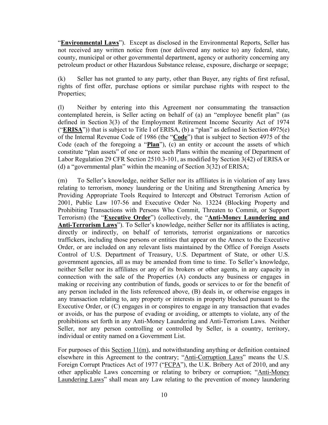 10 “Environmental Laws”). Except as disclosed in the Environmental Reports, Seller has not received any written notice from (nor delivered any notice to) any federal, state, county, municipal or other governmental department, agency or authority concerning any petroleum product or other Hazardous Substance release, exposure, discharge or seepage; (k) Seller has not granted to any party, other than Buyer, any rights of first refusal, rights of first offer, purchase options or similar purchase rights with respect to the Properties; (l) Neither by entering into this Agreement nor consummating the transaction contemplated herein, is Seller acting on behalf of (a) an “employee benefit plan” (as defined in Section 3(3) of the Employment Retirement Income Security Act of 1974 (“ERISA”)) that is subject to Title I of ERISA, (b) a “plan” as defined in Section 4975(e) of the Internal Revenue Code of 1986 (the “Code”) that is subject to Section 4975 of the Code (each of the foregoing a “Plan”), (c) an entity or account the assets of which constitute “plan assets” of one or more such Plans within the meaning of Department of Labor Regulation 29 CFR Section 2510.3-101, as modified by Section 3(42) of ERISA or (d) a “governmental plan” within the meaning of Section 3(32) of ERISA; (m) To Seller’s knowledge, neither Seller nor its affiliates is in violation of any laws relating to terrorism, money laundering or the Uniting and Strengthening America by Providing Appropriate Tools Required to Intercept and Obstruct Terrorism Action of 2001, Public Law 107-56 and Executive Order No. 13224 (Blocking Property and Prohibiting Transactions with Persons Who Commit, Threaten to Commit, or Support Terrorism) (the “Executive Order”) (collectively, the “Anti-Money Laundering and Anti-Terrorism Laws”). To Seller’s knowledge, neither Seller nor its affiliates is acting, directly or indirectly, on behalf of terrorists, terrorist organizations or narcotics traffickers, including those persons or entities that appear on the Annex to the Executive Order, or are included on any relevant lists maintained by the Office of Foreign Assets Control of U.S. Department of Treasury, U.S. Department of State, or other U.S. government agencies, all as may be amended from time to time. To Seller’s knowledge, neither Seller nor its affiliates or any of its brokers or other agents, in any capacity in connection with the sale of the Properties (A) conducts any business or engages in making or receiving any contribution of funds, goods or services to or for the benefit of any person included in the lists referenced above, (B) deals in, or otherwise engages in any transaction relating to, any property or interests in property blocked pursuant to the Executive Order, or (C) engages in or conspires to engage in any transaction that evades or avoids, or has the purpose of evading or avoiding, or attempts to violate, any of the prohibitions set forth in any Anti-Money Laundering and Anti-Terrorism Laws. Neither Seller, nor any person controlling or controlled by Seller, is a country, territory, individual or entity named on a Government List. For purposes of this Section 11(m), and notwithstanding anything or definition contained elsewhere in this Agreement to the contrary; “Anti-Corruption Laws” means the U.S. Foreign Corrupt Practices Act of 1977 (“FCPA”), the U.K. Bribery Act of 2010, and any other applicable Laws concerning or relating to bribery or corruption; “Anti-Money Laundering Laws” shall mean any Law relating to the prevention of money laundering