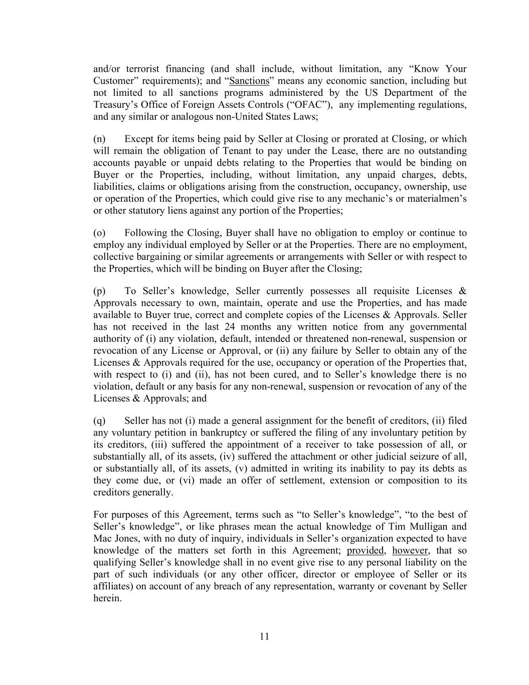 11 and/or terrorist financing (and shall include, without limitation, any “Know Your Customer” requirements); and “Sanctions” means any economic sanction, including but not limited to all sanctions programs administered by the US Department of the Treasury’s Office of Foreign Assets Controls (“OFAC”), any implementing regulations, and any similar or analogous non-United States Laws; (n) Except for items being paid by Seller at Closing or prorated at Closing, or which will remain the obligation of Tenant to pay under the Lease, there are no outstanding accounts payable or unpaid debts relating to the Properties that would be binding on Buyer or the Properties, including, without limitation, any unpaid charges, debts, liabilities, claims or obligations arising from the construction, occupancy, ownership, use or operation of the Properties, which could give rise to any mechanic’s or materialmen’s or other statutory liens against any portion of the Properties; (o) Following the Closing, Buyer shall have no obligation to employ or continue to employ any individual employed by Seller or at the Properties. There are no employment, collective bargaining or similar agreements or arrangements with Seller or with respect to the Properties, which will be binding on Buyer after the Closing; (p) To Seller’s knowledge, Seller currently possesses all requisite Licenses & Approvals necessary to own, maintain, operate and use the Properties, and has made available to Buyer true, correct and complete copies of the Licenses & Approvals. Seller has not received in the last 24 months any written notice from any governmental authority of (i) any violation, default, intended or threatened non-renewal, suspension or revocation of any License or Approval, or (ii) any failure by Seller to obtain any of the Licenses & Approvals required for the use, occupancy or operation of the Properties that, with respect to (i) and (ii), has not been cured, and to Seller’s knowledge there is no violation, default or any basis for any non-renewal, suspension or revocation of any of the Licenses & Approvals; and (q) Seller has not (i) made a general assignment for the benefit of creditors, (ii) filed any voluntary petition in bankruptcy or suffered the filing of any involuntary petition by its creditors, (iii) suffered the appointment of a receiver to take possession of all, or substantially all, of its assets, (iv) suffered the attachment or other judicial seizure of all, or substantially all, of its assets, (v) admitted in writing its inability to pay its debts as they come due, or (vi) made an offer of settlement, extension or composition to its creditors generally. For purposes of this Agreement, terms such as “to Seller’s knowledge”, “to the best of Seller’s knowledge”, or like phrases mean the actual knowledge of Tim Mulligan and Mac Jones, with no duty of inquiry, individuals in Seller’s organization expected to have knowledge of the matters set forth in this Agreement; provided, however, that so qualifying Seller’s knowledge shall in no event give rise to any personal liability on the part of such individuals (or any other officer, director or employee of Seller or its affiliates) on account of any breach of any representation, warranty or covenant by Seller herein.
