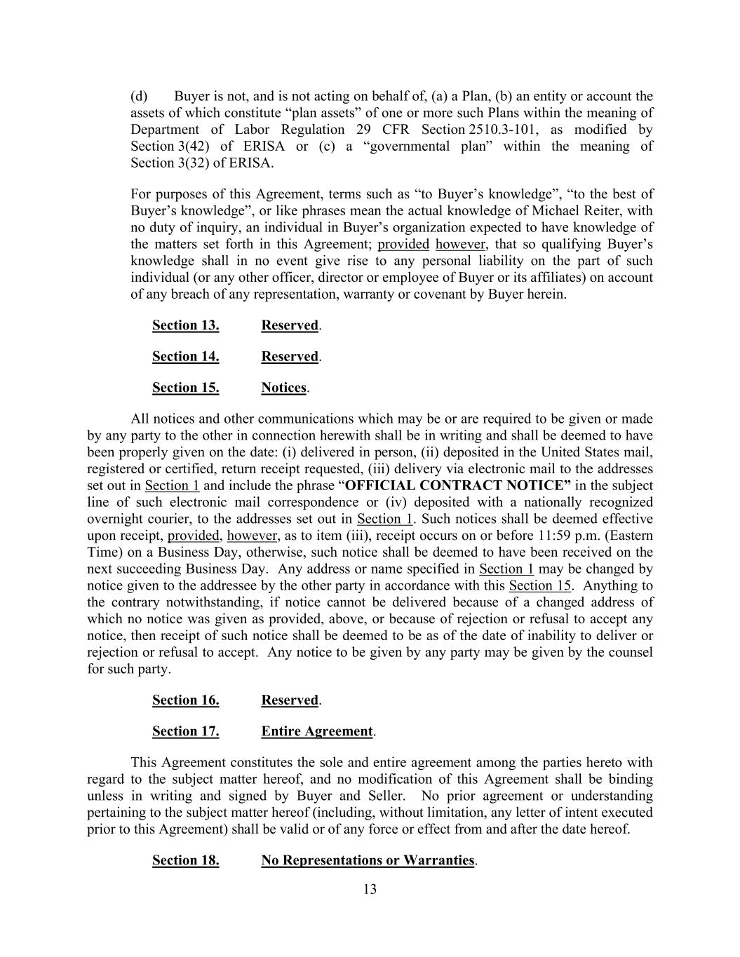 13 (d) Buyer is not, and is not acting on behalf of, (a) a Plan, (b) an entity or account the assets of which constitute “plan assets” of one or more such Plans within the meaning of Department of Labor Regulation 29 CFR Section 2510.3-101, as modified by Section 3(42) of ERISA or (c) a “governmental plan” within the meaning of Section 3(32) of ERISA. For purposes of this Agreement, terms such as “to Buyer’s knowledge”, “to the best of Buyer’s knowledge”, or like phrases mean the actual knowledge of Michael Reiter, with no duty of inquiry, an individual in Buyer’s organization expected to have knowledge of the matters set forth in this Agreement; provided however, that so qualifying Buyer’s knowledge shall in no event give rise to any personal liability on the part of such individual (or any other officer, director or employee of Buyer or its affiliates) on account of any breach of any representation, warranty or covenant by Buyer herein. Section 13. Reserved. Section 14. Reserved. Section 15. Notices. All notices and other communications which may be or are required to be given or made by any party to the other in connection herewith shall be in writing and shall be deemed to have been properly given on the date: (i) delivered in person, (ii) deposited in the United States mail, registered or certified, return receipt requested, (iii) delivery via electronic mail to the addresses set out in Section 1 and include the phrase “OFFICIAL CONTRACT NOTICE” in the subject line of such electronic mail correspondence or (iv) deposited with a nationally recognized overnight courier, to the addresses set out in Section 1. Such notices shall be deemed effective upon receipt, provided, however, as to item (iii), receipt occurs on or before 11:59 p.m. (Eastern Time) on a Business Day, otherwise, such notice shall be deemed to have been received on the next succeeding Business Day. Any address or name specified in Section 1 may be changed by notice given to the addressee by the other party in accordance with this Section 15. Anything to the contrary notwithstanding, if notice cannot be delivered because of a changed address of which no notice was given as provided, above, or because of rejection or refusal to accept any notice, then receipt of such notice shall be deemed to be as of the date of inability to deliver or rejection or refusal to accept. Any notice to be given by any party may be given by the counsel for such party. Section 16. Reserved. Section 17. Entire Agreement. This Agreement constitutes the sole and entire agreement among the parties hereto with regard to the subject matter hereof, and no modification of this Agreement shall be binding unless in writing and signed by Buyer and Seller. No prior agreement or understanding pertaining to the subject matter hereof (including, without limitation, any letter of intent executed prior to this Agreement) shall be valid or of any force or effect from and after the date hereof. Section 18. No Representations or Warranties.