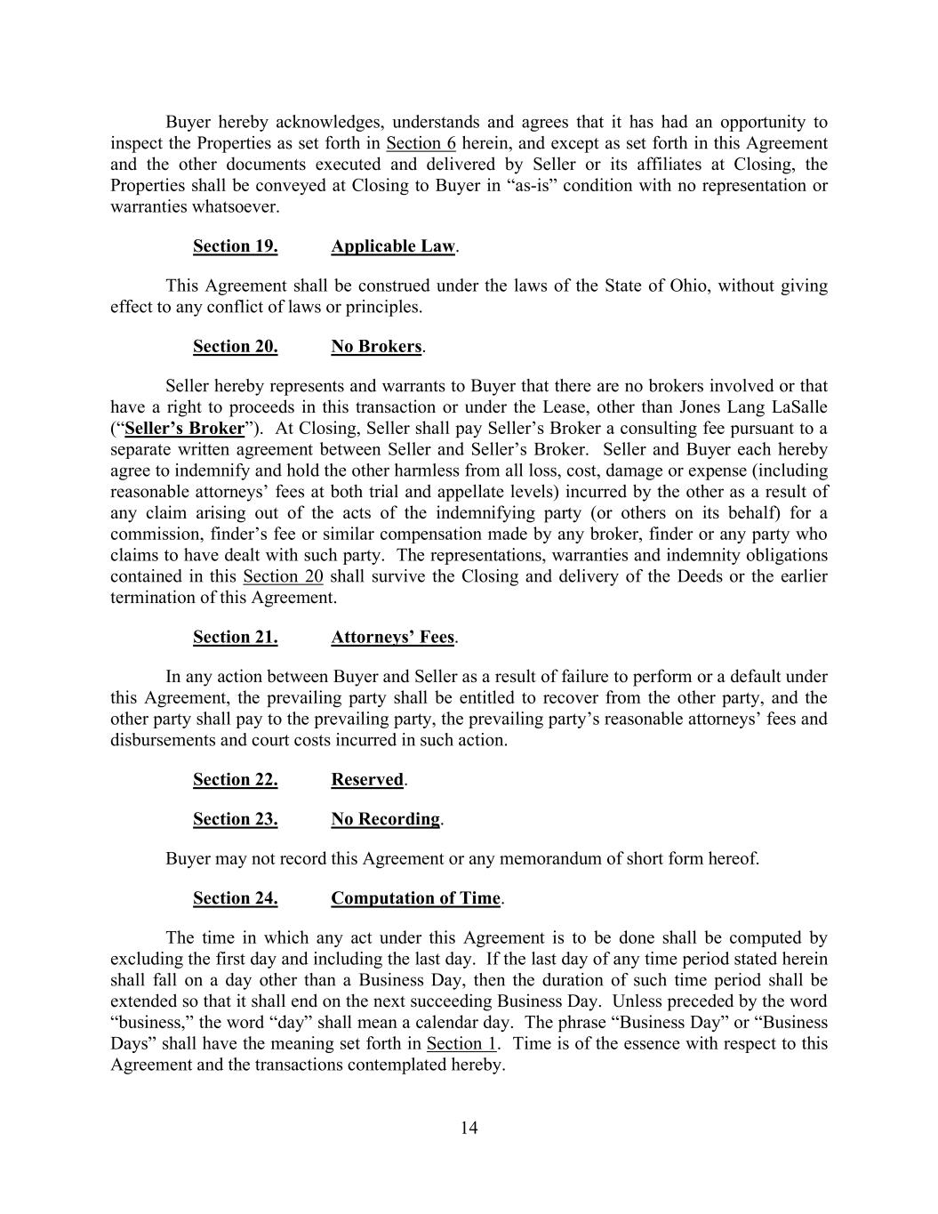 14 Buyer hereby acknowledges, understands and agrees that it has had an opportunity to inspect the Properties as set forth in Section 6 herein, and except as set forth in this Agreement and the other documents executed and delivered by Seller or its affiliates at Closing, the Properties shall be conveyed at Closing to Buyer in “as-is” condition with no representation or warranties whatsoever. Section 19. Applicable Law. This Agreement shall be construed under the laws of the State of Ohio, without giving effect to any conflict of laws or principles. Section 20. No Brokers. Seller hereby represents and warrants to Buyer that there are no brokers involved or that have a right to proceeds in this transaction or under the Lease, other than Jones Lang LaSalle (“Seller’s Broker”). At Closing, Seller shall pay Seller’s Broker a consulting fee pursuant to a separate written agreement between Seller and Seller’s Broker. Seller and Buyer each hereby agree to indemnify and hold the other harmless from all loss, cost, damage or expense (including reasonable attorneys’ fees at both trial and appellate levels) incurred by the other as a result of any claim arising out of the acts of the indemnifying party (or others on its behalf) for a commission, finder’s fee or similar compensation made by any broker, finder or any party who claims to have dealt with such party. The representations, warranties and indemnity obligations contained in this Section 20 shall survive the Closing and delivery of the Deeds or the earlier termination of this Agreement. Section 21. Attorneys’ Fees. In any action between Buyer and Seller as a result of failure to perform or a default under this Agreement, the prevailing party shall be entitled to recover from the other party, and the other party shall pay to the prevailing party, the prevailing party’s reasonable attorneys’ fees and disbursements and court costs incurred in such action. Section 22. Reserved. Section 23. No Recording. Buyer may not record this Agreement or any memorandum of short form hereof. Section 24. Computation of Time. The time in which any act under this Agreement is to be done shall be computed by excluding the first day and including the last day. If the last day of any time period stated herein shall fall on a day other than a Business Day, then the duration of such time period shall be extended so that it shall end on the next succeeding Business Day. Unless preceded by the word “business,” the word “day” shall mean a calendar day. The phrase “Business Day” or “Business Days” shall have the meaning set forth in Section 1. Time is of the essence with respect to this Agreement and the transactions contemplated hereby.