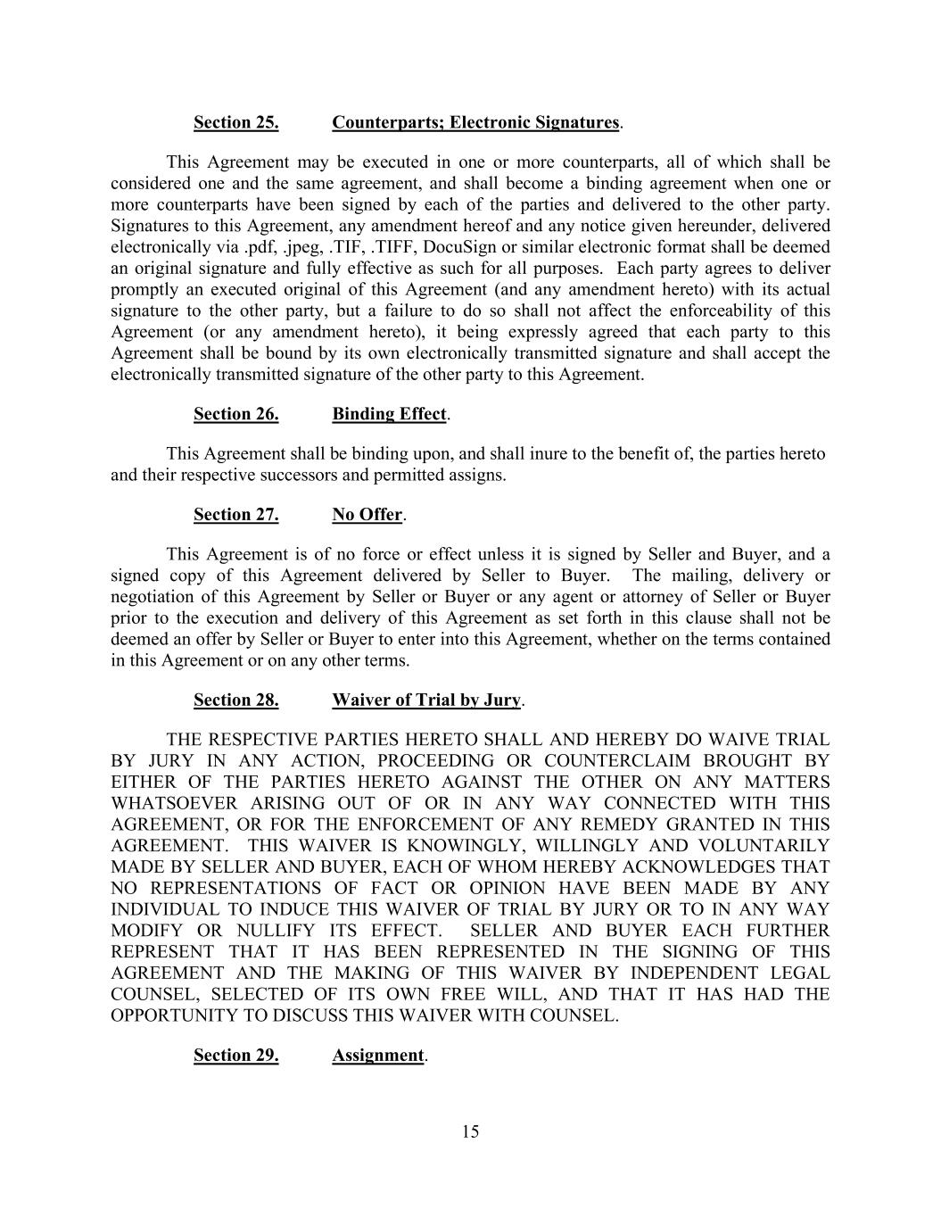 15 Section 25. Counterparts; Electronic Signatures. This Agreement may be executed in one or more counterparts, all of which shall be considered one and the same agreement, and shall become a binding agreement when one or more counterparts have been signed by each of the parties and delivered to the other party. Signatures to this Agreement, any amendment hereof and any notice given hereunder, delivered electronically via .pdf, .jpeg, .TIF, .TIFF, DocuSign or similar electronic format shall be deemed an original signature and fully effective as such for all purposes. Each party agrees to deliver promptly an executed original of this Agreement (and any amendment hereto) with its actual signature to the other party, but a failure to do so shall not affect the enforceability of this Agreement (or any amendment hereto), it being expressly agreed that each party to this Agreement shall be bound by its own electronically transmitted signature and shall accept the electronically transmitted signature of the other party to this Agreement. Section 26. Binding Effect. This Agreement shall be binding upon, and shall inure to the benefit of, the parties hereto and their respective successors and permitted assigns. Section 27. No Offer. This Agreement is of no force or effect unless it is signed by Seller and Buyer, and a signed copy of this Agreement delivered by Seller to Buyer. The mailing, delivery or negotiation of this Agreement by Seller or Buyer or any agent or attorney of Seller or Buyer prior to the execution and delivery of this Agreement as set forth in this clause shall not be deemed an offer by Seller or Buyer to enter into this Agreement, whether on the terms contained in this Agreement or on any other terms. Section 28. Waiver of Trial by Jury. THE RESPECTIVE PARTIES HERETO SHALL AND HEREBY DO WAIVE TRIAL BY JURY IN ANY ACTION, PROCEEDING OR COUNTERCLAIM BROUGHT BY EITHER OF THE PARTIES HERETO AGAINST THE OTHER ON ANY MATTERS WHATSOEVER ARISING OUT OF OR IN ANY WAY CONNECTED WITH THIS AGREEMENT, OR FOR THE ENFORCEMENT OF ANY REMEDY GRANTED IN THIS AGREEMENT. THIS WAIVER IS KNOWINGLY, WILLINGLY AND VOLUNTARILY MADE BY SELLER AND BUYER, EACH OF WHOM HEREBY ACKNOWLEDGES THAT NO REPRESENTATIONS OF FACT OR OPINION HAVE BEEN MADE BY ANY INDIVIDUAL TO INDUCE THIS WAIVER OF TRIAL BY JURY OR TO IN ANY WAY MODIFY OR NULLIFY ITS EFFECT. SELLER AND BUYER EACH FURTHER REPRESENT THAT IT HAS BEEN REPRESENTED IN THE SIGNING OF THIS AGREEMENT AND THE MAKING OF THIS WAIVER BY INDEPENDENT LEGAL COUNSEL, SELECTED OF ITS OWN FREE WILL, AND THAT IT HAS HAD THE OPPORTUNITY TO DISCUSS THIS WAIVER WITH COUNSEL. Section 29. Assignment.