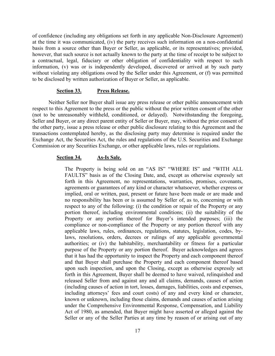 17 of confidence (including any obligations set forth in any applicable Non-Disclosure Agreement) at the time it was communicated, (iv) the party receives such information on a non-confidential basis from a source other than Buyer or Seller, as applicable, or its representatives; provided, however, that such source is not actually known to the party at the time of receipt to be subject to a contractual, legal, fiduciary or other obligation of confidentiality with respect to such information, (v) was or is independently developed, discovered or arrived at by such party without violating any obligations owed by the Seller under this Agreement, or (f) was permitted to be disclosed by written authorization of Buyer or Seller, as applicable. Section 33. Press Release. Neither Seller nor Buyer shall issue any press release or other public announcement with respect to this Agreement to the press or the public without the prior written consent of the other (not to be unreasonably withheld, conditioned, or delayed). Notwithstanding the foregoing, Seller and Buyer, or any direct parent entity of Seller or Buyer, may, without the prior consent of the other party, issue a press release or other public disclosure relating to this Agreement and the transactions contemplated hereby, as the disclosing party may determine is required under the Exchange Act, the Securities Act, the rules and regulations of the U.S. Securities and Exchange Commission or any Securities Exchange, or other applicable laws, rules or regulations. Section 34. As-Is Sale. The Property is being sold on an “AS IS” “WHERE IS” and “WITH ALL FAULTS” basis as of the Closing Date, and, except as otherwise expressly set forth in this Agreement, no representations, warranties, promises, covenants, agreements or guarantees of any kind or character whatsoever, whether express or implied, oral or written, past, present or future have been made or are made and no responsibility has been or is assumed by Seller of, as to, concerning or with respect to any of the following: (i) the condition or repair of the Property or any portion thereof, including environmental conditions; (ii) the suitability of the Property or any portion thereof for Buyer’s intended purposes; (iii) the compliance or non-compliance of the Property or any portion thereof with any applicable laws, rules, ordinances, regulations, statutes, legislation, codes, by- laws, resolutions, orders, decrees or rulings of any applicable governmental authorities; or (iv) the habitability, merchantability or fitness for a particular purpose of the Property or any portion thereof. Buyer acknowledges and agrees that it has had the opportunity to inspect the Property and each component thereof and that Buyer shall purchase the Property and each component thereof based upon such inspection, and upon the Closing, except as otherwise expressly set forth in this Agreement, Buyer shall be deemed to have waived, relinquished and released Seller from and against any and all claims, demands, causes of action (including causes of action in tort, losses, damages, liabilities, costs and expenses, including attorneys’ fees and court costs) of any and every kind or character, known or unknown, including those claims, demands and causes of action arising under the Comprehensive Environmental Response, Compensation, and Liability Act of 1980, as amended, that Buyer might have asserted or alleged against the Seller or any of the Seller Parties at any time by reason of or arising out of any