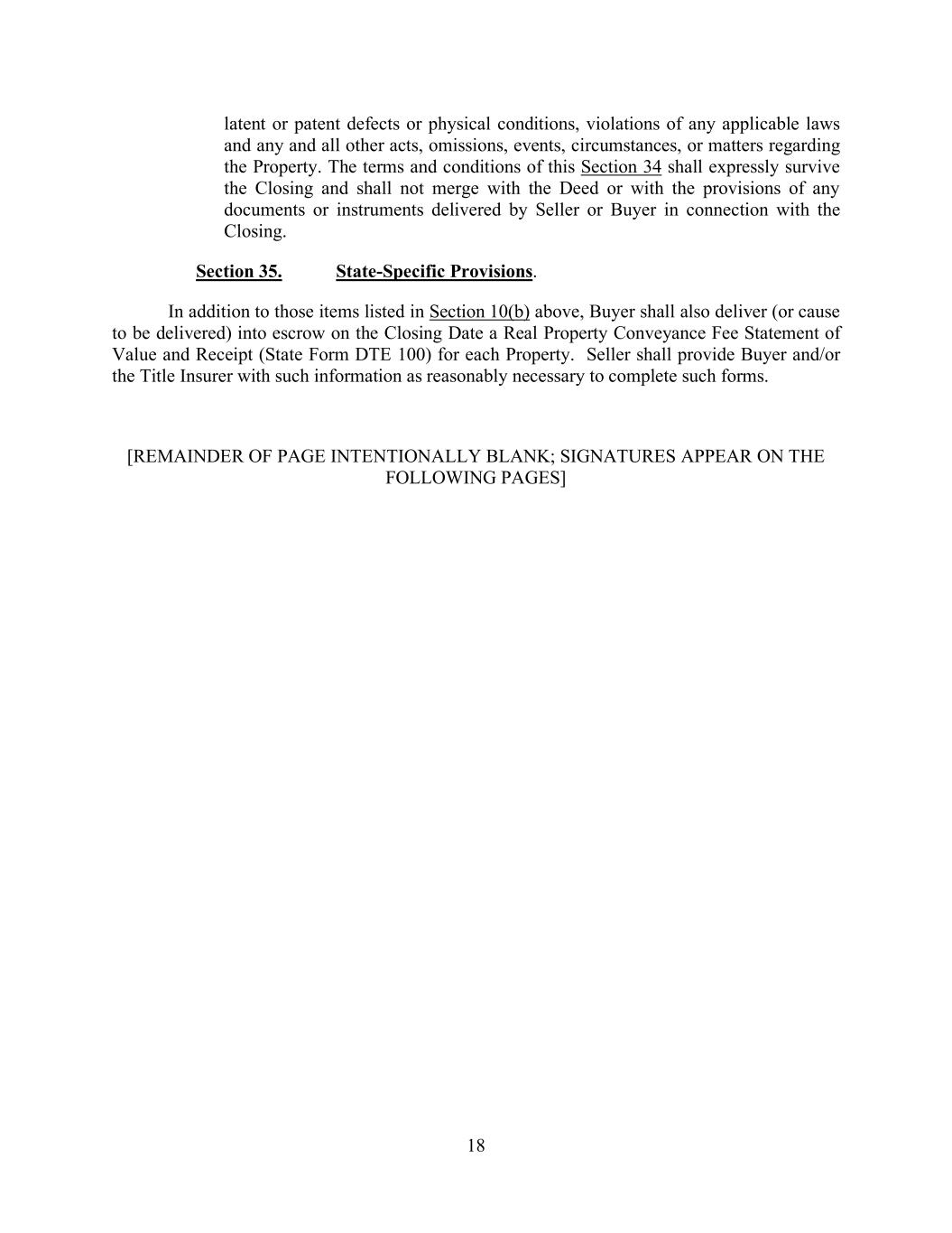 18 latent or patent defects or physical conditions, violations of any applicable laws and any and all other acts, omissions, events, circumstances, or matters regarding the Property. The terms and conditions of this Section 34 shall expressly survive the Closing and shall not merge with the Deed or with the provisions of any documents or instruments delivered by Seller or Buyer in connection with the Closing. Section 35. State-Specific Provisions. In addition to those items listed in Section 10(b) above, Buyer shall also deliver (or cause to be delivered) into escrow on the Closing Date a Real Property Conveyance Fee Statement of Value and Receipt (State Form DTE 100) for each Property. Seller shall provide Buyer and/or the Title Insurer with such information as reasonably necessary to complete such forms. [REMAINDER OF PAGE INTENTIONALLY BLANK; SIGNATURES APPEAR ON THE FOLLOWING PAGES]