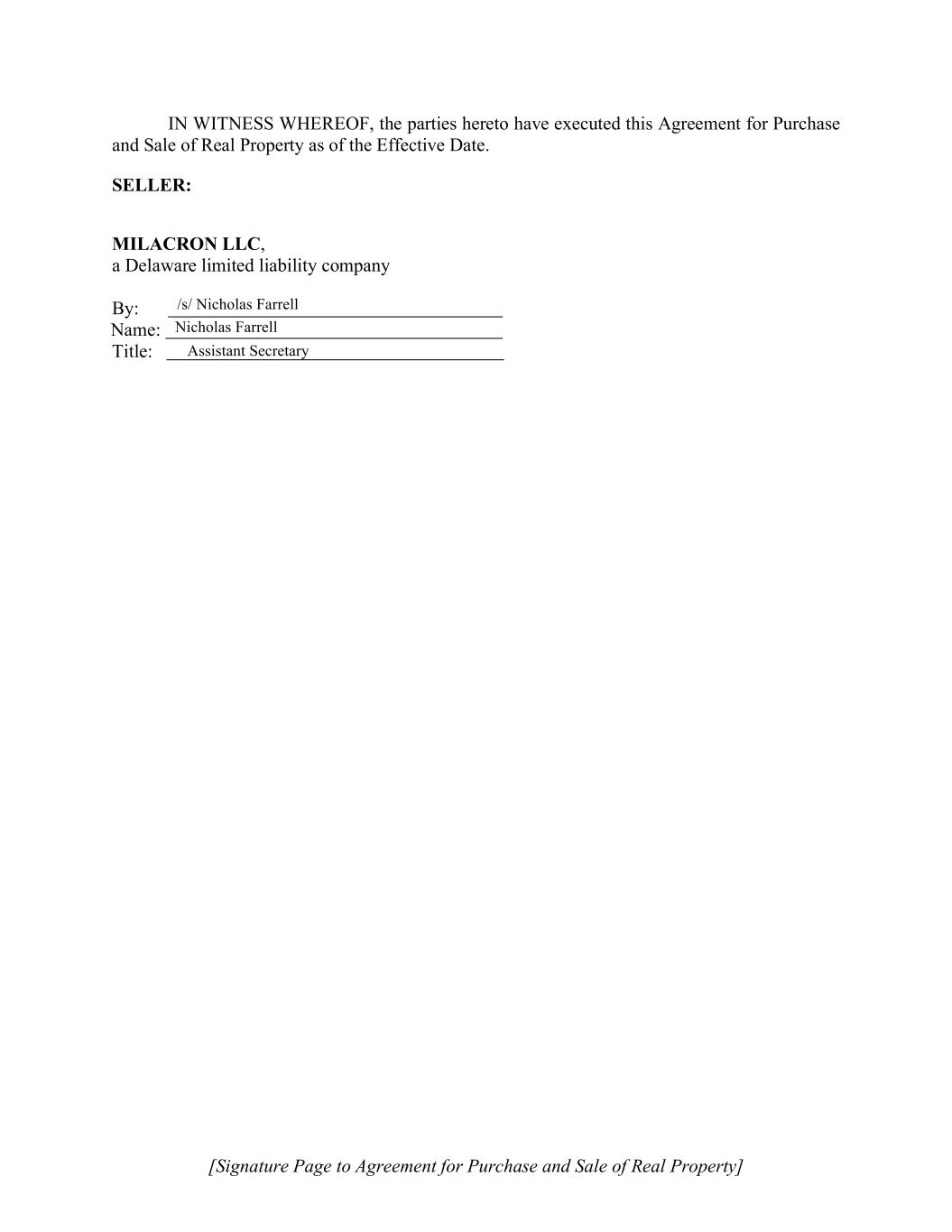 [Signature Page to Agreement for Purchase and Sale of Real Property] IN WITNESS WHEREOF, the parties hereto have executed this Agreement for Purchase and Sale of Real Property as of the Effective Date. SELLER: MILACRON LLC, a Delaware limited liability company By: Name: Title: /s/ Nicholas Farrell Nicholas Farrell Assistant Secretary