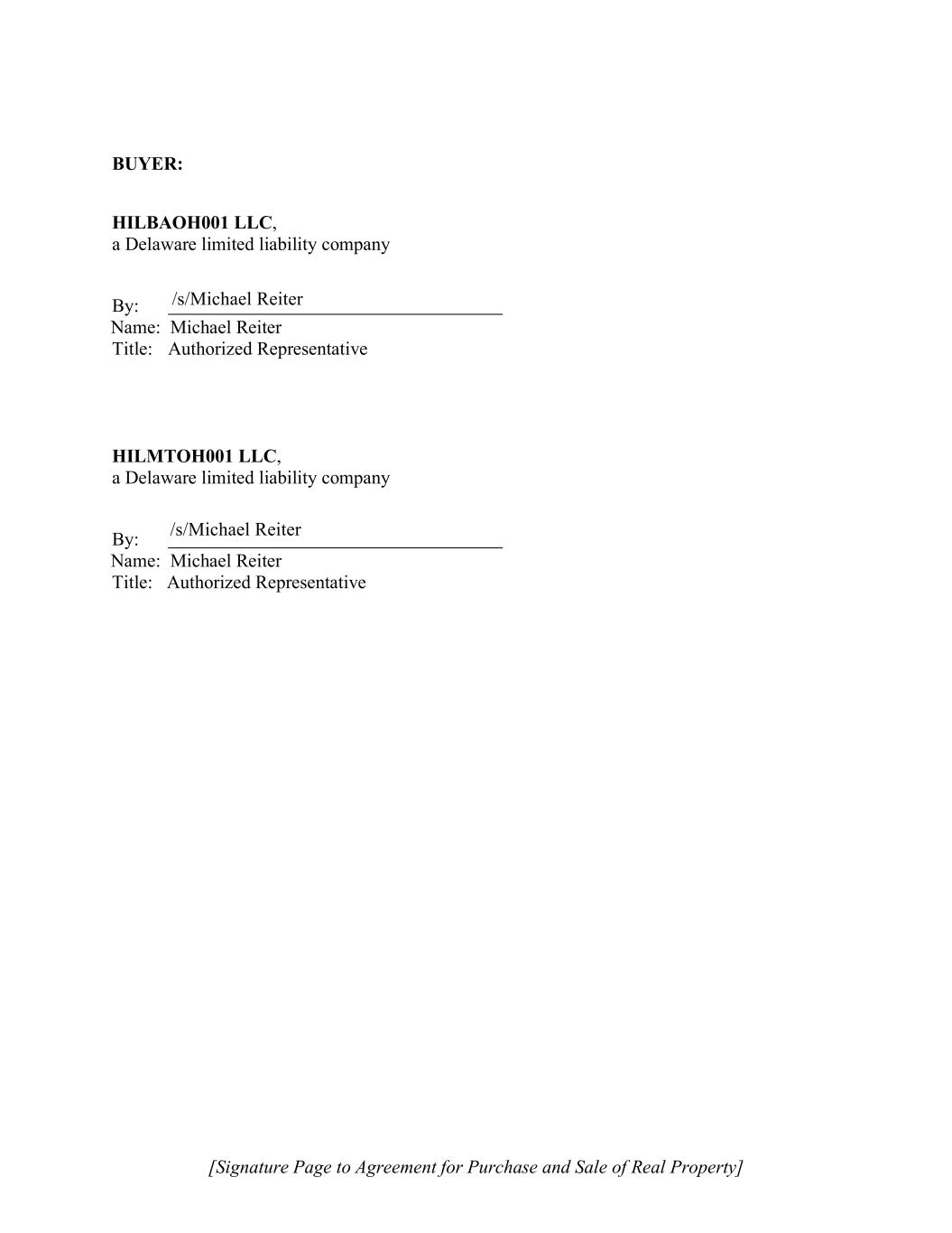 [Signature Page to Agreement for Purchase and Sale of Real Property] BUYER: HILBAOH001 LLC, a Delaware limited liability company By: Name: Michael Reiter Title: Authorized Representative HILMTOH001 LLC, a Delaware limited liability company By: Name: Michael Reiter Title: Authorized Representative /s/Michael Reiter /s/Michael Reiter
