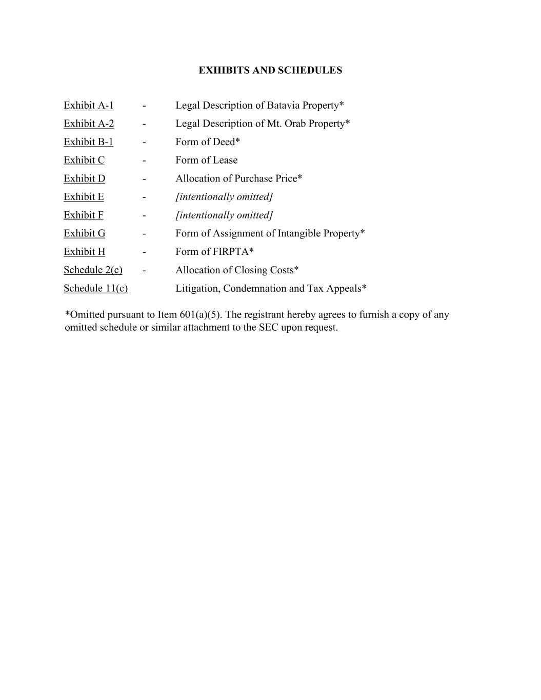 EXHIBITS AND SCHEDULES Exhibit A-1 Exhibit A-2 Exhibit B-1 Exhibit C Exhibit D Exhibit E Exhibit F Exhibit G Exhibit H Schedule 2(c) Schedule 11(c) - Legal Description of Batavia Property* - Legal Description of Mt. Orab Property* - Form of Deed* - Form of Lease - Allocation of Purchase Price* - [intentionally omitted] - [intentionally omitted] - Form of Assignment of Intangible Property* - Form of FIRPTA* - Allocation of Closing Costs* Litigation, Condemnation and Tax Appeals* *Omitted pursuant to Item 601(a)(5). The registrant hereby agrees to furnish a copy of any omitted schedule or similar attachment to the SEC upon request.