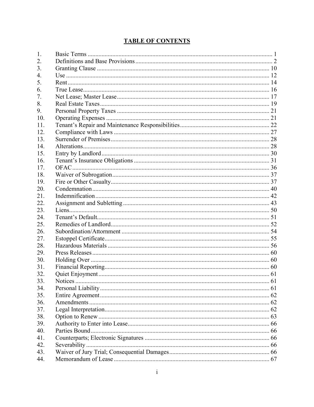 i TABLE OF CONTENTS 1. Basic Terms ........................................................................................................................ 1 2. Definitions and Base Provisions ......................................................................................... 2 3. Granting Clause ................................................................................................................ 10 4. Use .................................................................................................................................... 12 5. Rent ................................................................................................................................... 14 6. True Lease ......................................................................................................................... 16 7. Net Lease; Master Lease ................................................................................................... 17 8. Real Estate Taxes .............................................................................................................. 19 9. Personal Property Taxes ................................................................................................... 21 10. Operating Expenses .......................................................................................................... 21 11. Tenant’s Repair and Maintenance Responsibilities .......................................................... 22 12. Compliance with Laws ..................................................................................................... 27 13. Surrender of Premises ....................................................................................................... 28 14. Alterations ......................................................................................................................... 28 15. Entry by Landlord ............................................................................................................. 30 16. Tenant’s Insurance Obligations ........................................................................................ 31 17. OFAC ................................................................................................................................ 36 18. Waiver of Subrogation ...................................................................................................... 37 19. Fire or Other Casualty ....................................................................................................... 37 20. Condemnation ................................................................................................................... 40 21. Indemnification ................................................................................................................. 42 22. Assignment and Subletting ............................................................................................... 43 23. Liens .................................................................................................................................. 50 24. Tenant’s Default................................................................................................................ 51 25. Remedies of Landlord ....................................................................................................... 52 26. Subordination/Attornment ................................................................................................ 54 27. Estoppel Certificate ........................................................................................................... 55 28. Hazardous Materials ......................................................................................................... 56 29. Press Releases ................................................................................................................... 60 30. Holding Over .................................................................................................................... 60 31. Financial Reporting ........................................................................................................... 60 32. Quiet Enjoyment ............................................................................................................... 61 33. Notices .............................................................................................................................. 61 34. Personal Liability .............................................................................................................. 61 35. Entire Agreement .............................................................................................................. 62 36. Amendments ..................................................................................................................... 62 37. Legal Interpretation ........................................................................................................... 62 38. Option to Renew ............................................................................................................... 63 39. Authority to Enter into Lease ............................................................................................ 66 40. Parties Bound .................................................................................................................... 66 41. Counterparts; Electronic Signatures ................................................................................. 66 42. Severability ....................................................................................................................... 66 43. Waiver of Jury Trial; Consequential Damages ................................................................. 66 44. Memorandum of Lease ..................................................................................................... 67