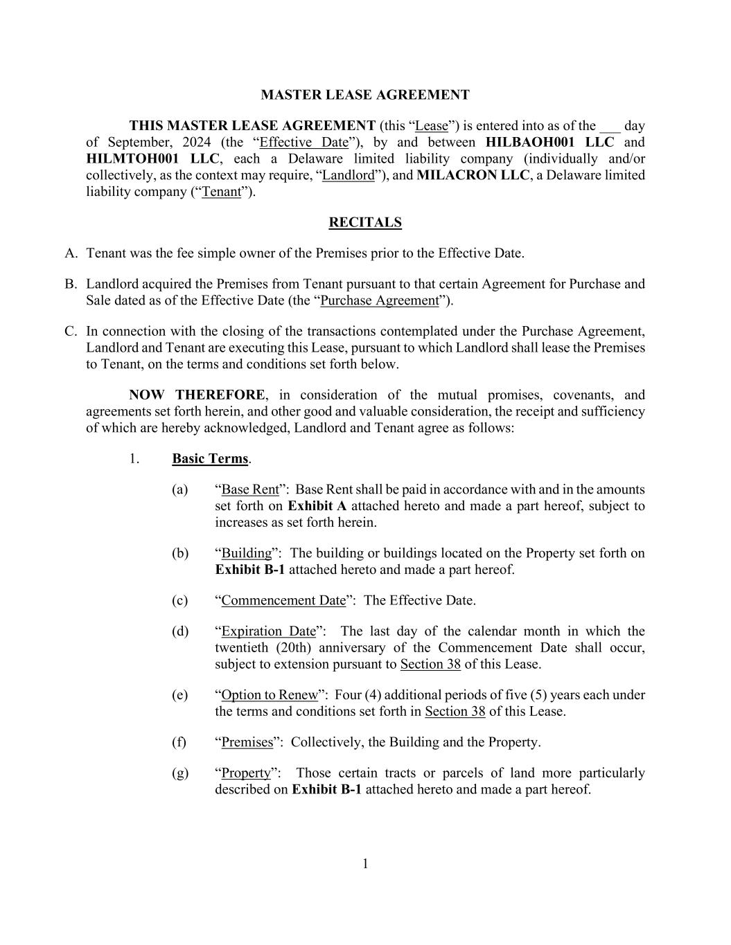 1 MASTER LEASE AGREEMENT THIS MASTER LEASE AGREEMENT (this “Lease”) is entered into as of the ___ day of September, 2024 (the “Effective Date”), by and between HILBAOH001 LLC and HILMTOH001 LLC, each a Delaware limited liability company (individually and/or collectively, as the context may require, “Landlord”), and MILACRON LLC, a Delaware limited liability company (“Tenant”). RECITALS A. Tenant was the fee simple owner of the Premises prior to the Effective Date. B. Landlord acquired the Premises from Tenant pursuant to that certain Agreement for Purchase and Sale dated as of the Effective Date (the “Purchase Agreement”). C. In connection with the closing of the transactions contemplated under the Purchase Agreement, Landlord and Tenant are executing this Lease, pursuant to which Landlord shall lease the Premises to Tenant, on the terms and conditions set forth below. NOW THEREFORE, in consideration of the mutual promises, covenants, and agreements set forth herein, and other good and valuable consideration, the receipt and sufficiency of which are hereby acknowledged, Landlord and Tenant agree as follows: 1. Basic Terms. (a) “Base Rent”: Base Rent shall be paid in accordance with and in the amounts set forth on Exhibit A attached hereto and made a part hereof, subject to increases as set forth herein. (b) “Building”: The building or buildings located on the Property set forth on Exhibit B-1 attached hereto and made a part hereof. (c) “Commencement Date”: The Effective Date. (d) “Expiration Date”: The last day of the calendar month in which the twentieth (20th) anniversary of the Commencement Date shall occur, subject to extension pursuant to Section 38 of this Lease. (e) “Option to Renew”: Four (4) additional periods of five (5) years each under the terms and conditions set forth in Section 38 of this Lease. (f) “Premises”: Collectively, the Building and the Property. (g) “Property”: Those certain tracts or parcels of land more particularly described on Exhibit B-1 attached hereto and made a part hereof.