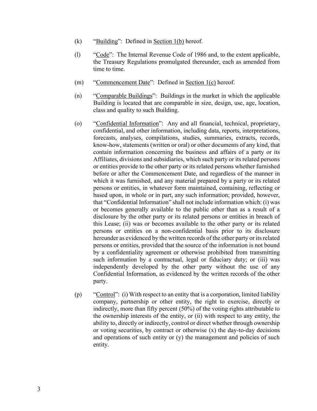 3 (k) “Building”: Defined in Section 1(b) hereof. (l) “Code”: The Internal Revenue Code of 1986 and, to the extent applicable, the Treasury Regulations promulgated thereunder, each as amended from time to time. (m) “Commencement Date”: Defined in Section 1(c) hereof. (n) “Comparable Buildings”: Buildings in the market in which the applicable Building is located that are comparable in size, design, use, age, location, class and quality to such Building. (o) “Confidential Information”: Any and all financial, technical, proprietary, confidential, and other information, including data, reports, interpretations, forecasts, analyses, compilations, studies, summaries, extracts, records, know-how, statements (written or oral) or other documents of any kind, that contain information concerning the business and affairs of a party or its Affiliates, divisions and subsidiaries, which such party or its related persons or entities provide to the other party or its related persons whether furnished before or after the Commencement Date, and regardless of the manner in which it was furnished, and any material prepared by a party or its related persons or entities, in whatever form maintained, containing, reflecting or based upon, in whole or in part, any such information; provided, however, that “Confidential Information” shall not include information which: (i) was or becomes generally available to the public other than as a result of a disclosure by the other party or its related persons or entities in breach of this Lease; (ii) was or becomes available to the other party or its related persons or entities on a non-confidential basis prior to its disclosure hereunder as evidenced by the written records of the other party or its related persons or entities, provided that the source of the information is not bound by a confidentiality agreement or otherwise prohibited from transmitting such information by a contractual, legal or fiduciary duty; or (iii) was independently developed by the other party without the use of any Confidential Information, as evidenced by the written records of the other party. (p) “Control”: (i) With respect to an entity that is a corporation, limited liability company, partnership or other entity, the right to exercise, directly or indirectly, more than fifty percent (50%) of the voting rights attributable to the ownership interests of the entity, or (ii) with respect to any entity, the ability to, directly or indirectly, control or direct whether through ownership or voting securities, by contract or otherwise (x) the day-to-day decisions and operations of such entity or (y) the management and policies of such entity.