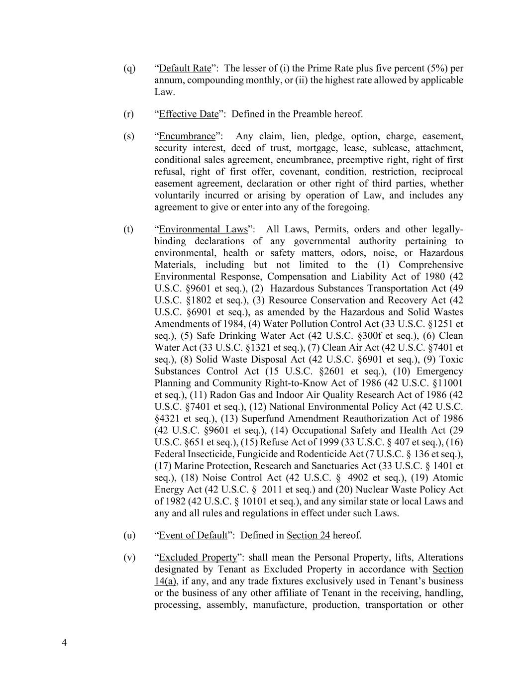 4 (q) “Default Rate”: The lesser of (i) the Prime Rate plus five percent (5%) per annum, compounding monthly, or (ii) the highest rate allowed by applicable Law. (r) “Effective Date”: Defined in the Preamble hereof. (s) “Encumbrance”: Any claim, lien, pledge, option, charge, easement, security interest, deed of trust, mortgage, lease, sublease, attachment, conditional sales agreement, encumbrance, preemptive right, right of first refusal, right of first offer, covenant, condition, restriction, reciprocal easement agreement, declaration or other right of third parties, whether voluntarily incurred or arising by operation of Law, and includes any agreement to give or enter into any of the foregoing. (t) “Environmental Laws”: All Laws, Permits, orders and other legally- binding declarations of any governmental authority pertaining to environmental, health or safety matters, odors, noise, or Hazardous Materials, including but not limited to the (1) Comprehensive Environmental Response, Compensation and Liability Act of 1980 (42 U.S.C. §9601 et seq.), (2) Hazardous Substances Transportation Act (49 U.S.C. §1802 et seq.), (3) Resource Conservation and Recovery Act (42 U.S.C. §6901 et seq.), as amended by the Hazardous and Solid Wastes Amendments of 1984, (4) Water Pollution Control Act (33 U.S.C. §1251 et seq.), (5) Safe Drinking Water Act (42 U.S.C. §300f et seq.), (6) Clean Water Act (33 U.S.C. §1321 et seq.), (7) Clean Air Act (42 U.S.C. §7401 et seq.), (8) Solid Waste Disposal Act (42 U.S.C. §6901 et seq.), (9) Toxic Substances Control Act (15 U.S.C. §2601 et seq.), (10) Emergency Planning and Community Right-to-Know Act of 1986 (42 U.S.C. §11001 et seq.), (11) Radon Gas and Indoor Air Quality Research Act of 1986 (42 U.S.C. §7401 et seq.), (12) National Environmental Policy Act (42 U.S.C. §4321 et seq.), (13) Superfund Amendment Reauthorization Act of 1986 (42 U.S.C. §9601 et seq.), (14) Occupational Safety and Health Act (29 U.S.C. §651 et seq.), (15) Refuse Act of 1999 (33 U.S.C. § 407 et seq.), (16) Federal Insecticide, Fungicide and Rodenticide Act (7 U.S.C. § 136 et seq.), (17) Marine Protection, Research and Sanctuaries Act (33 U.S.C. § 1401 et seq.), (18) Noise Control Act (42 U.S.C. § 4902 et seq.), (19) Atomic Energy Act (42 U.S.C. § 2011 et seq.) and (20) Nuclear Waste Policy Act of 1982 (42 U.S.C. § 10101 et seq.), and any similar state or local Laws and any and all rules and regulations in effect under such Laws. (u) “Event of Default”: Defined in Section 24 hereof. (v) “Excluded Property”: shall mean the Personal Property, lifts, Alterations designated by Tenant as Excluded Property in accordance with Section 14(a), if any, and any trade fixtures exclusively used in Tenant’s business or the business of any other affiliate of Tenant in the receiving, handling, processing, assembly, manufacture, production, transportation or other