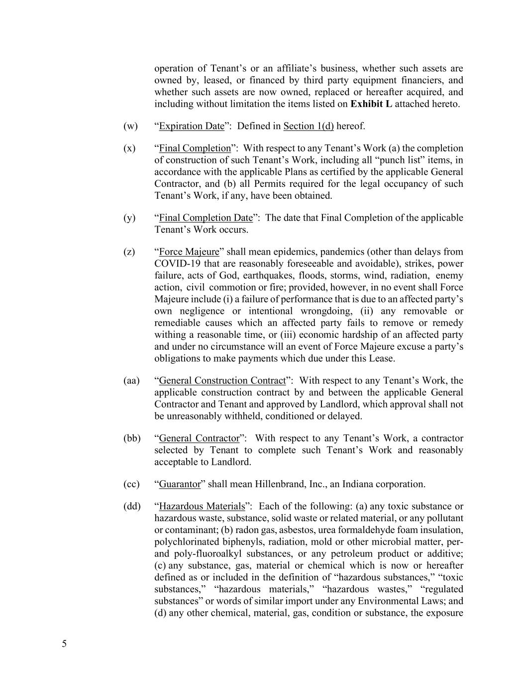 5 operation of Tenant’s or an affiliate’s business, whether such assets are owned by, leased, or financed by third party equipment financiers, and whether such assets are now owned, replaced or hereafter acquired, and including without limitation the items listed on Exhibit L attached hereto. (w) “Expiration Date”: Defined in Section 1(d) hereof. (x) “Final Completion”: With respect to any Tenant’s Work (a) the completion of construction of such Tenant’s Work, including all “punch list” items, in accordance with the applicable Plans as certified by the applicable General Contractor, and (b) all Permits required for the legal occupancy of such Tenant’s Work, if any, have been obtained. (y) “Final Completion Date”: The date that Final Completion of the applicable Tenant’s Work occurs. (z) “Force Majeure” shall mean epidemics, pandemics (other than delays from COVID-19 that are reasonably foreseeable and avoidable), strikes, power failure, acts of God, earthquakes, floods, storms, wind, radiation, enemy action, civil commotion or fire; provided, however, in no event shall Force Majeure include (i) a failure of performance that is due to an affected party’s own negligence or intentional wrongdoing, (ii) any removable or remediable causes which an affected party fails to remove or remedy withing a reasonable time, or (iii) economic hardship of an affected party and under no circumstance will an event of Force Majeure excuse a party’s obligations to make payments which due under this Lease. (aa) “General Construction Contract”: With respect to any Tenant’s Work, the applicable construction contract by and between the applicable General Contractor and Tenant and approved by Landlord, which approval shall not be unreasonably withheld, conditioned or delayed. (bb) “General Contractor”: With respect to any Tenant’s Work, a contractor selected by Tenant to complete such Tenant’s Work and reasonably acceptable to Landlord. (cc) “Guarantor” shall mean Hillenbrand, Inc., an Indiana corporation. (dd) “Hazardous Materials”: Each of the following: (a) any toxic substance or hazardous waste, substance, solid waste or related material, or any pollutant or contaminant; (b) radon gas, asbestos, urea formaldehyde foam insulation, polychlorinated biphenyls, radiation, mold or other microbial matter, per- and poly-fluoroalkyl substances, or any petroleum product or additive; (c) any substance, gas, material or chemical which is now or hereafter defined as or included in the definition of “hazardous substances,” “toxic substances,” “hazardous materials,” “hazardous wastes,” “regulated substances” or words of similar import under any Environmental Laws; and (d) any other chemical, material, gas, condition or substance, the exposure