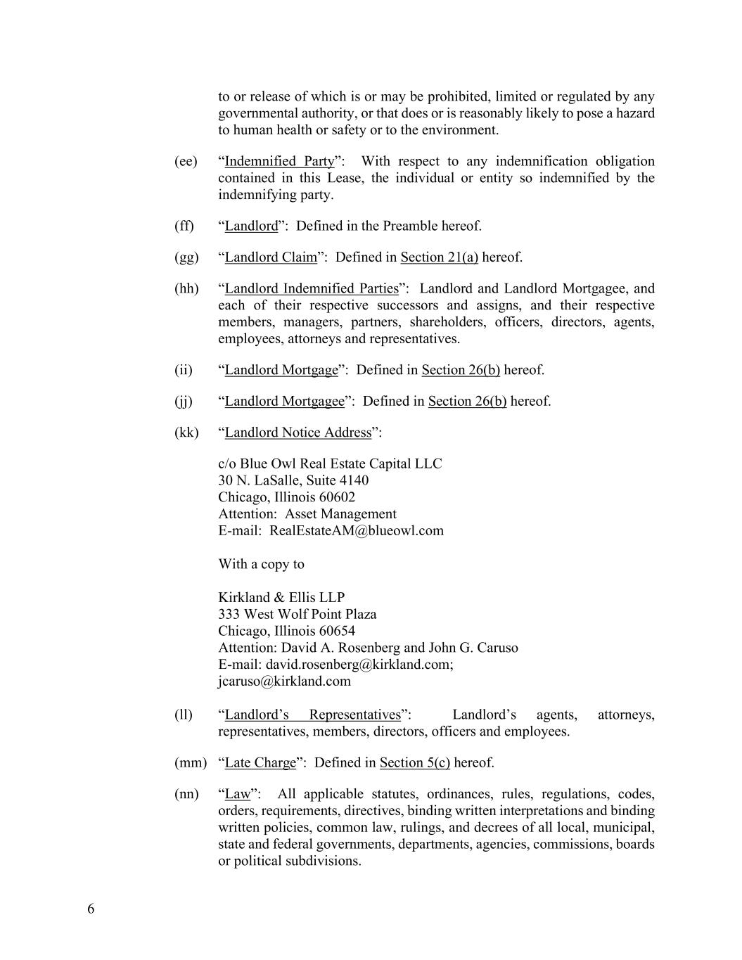 6 to or release of which is or may be prohibited, limited or regulated by any governmental authority, or that does or is reasonably likely to pose a hazard to human health or safety or to the environment. (ee) “Indemnified Party”: With respect to any indemnification obligation contained in this Lease, the individual or entity so indemnified by the indemnifying party. (ff) “Landlord”: Defined in the Preamble hereof. (gg) “Landlord Claim”: Defined in Section 21(a) hereof. (hh) “Landlord Indemnified Parties”: Landlord and Landlord Mortgagee, and each of their respective successors and assigns, and their respective members, managers, partners, shareholders, officers, directors, agents, employees, attorneys and representatives. (ii) “Landlord Mortgage”: Defined in Section 26(b) hereof. (jj) “Landlord Mortgagee”: Defined in Section 26(b) hereof. (kk) “Landlord Notice Address”: c/o Blue Owl Real Estate Capital LLC 30 N. LaSalle, Suite 4140 Chicago, Illinois 60602 Attention: Asset Management E-mail: RealEstateAM@blueowl.com With a copy to Kirkland & Ellis LLP 333 West Wolf Point Plaza Chicago, Illinois 60654 Attention: David A. Rosenberg and John G. Caruso E-mail: david.rosenberg@kirkland.com; jcaruso@kirkland.com (ll) “Landlord’s Representatives”: Landlord’s agents, attorneys, representatives, members, directors, officers and employees. (mm) “Late Charge”: Defined in Section 5(c) hereof. (nn) “Law”: All applicable statutes, ordinances, rules, regulations, codes, orders, requirements, directives, binding written interpretations and binding written policies, common law, rulings, and decrees of all local, municipal, state and federal governments, departments, agencies, commissions, boards or political subdivisions.