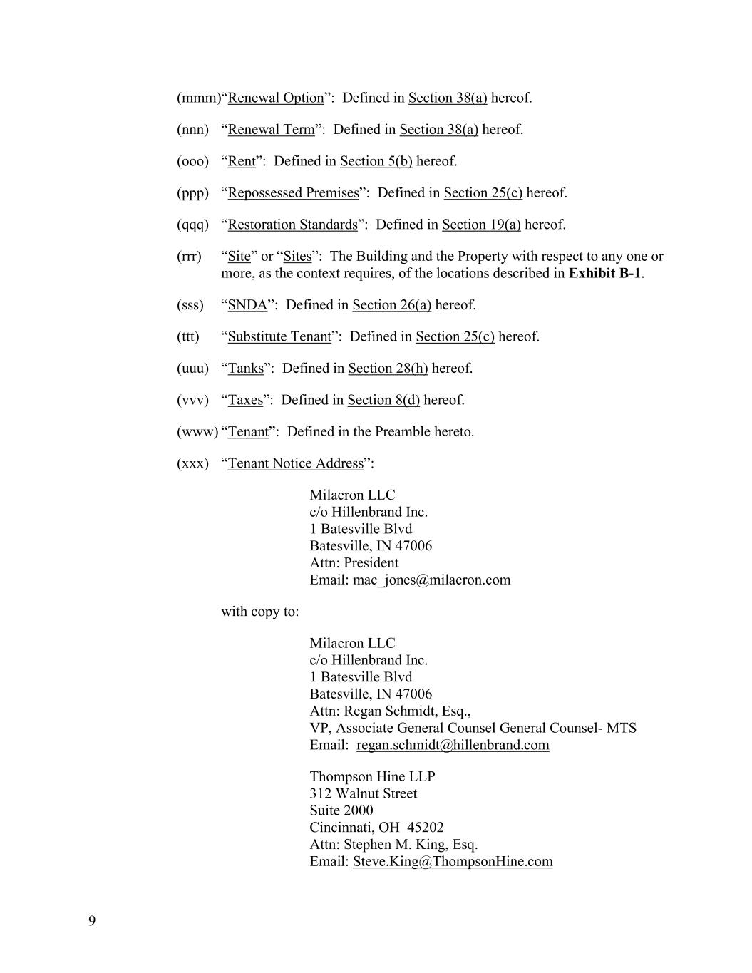 9 (mmm)“Renewal Option”: Defined in Section 38(a) hereof. (nnn) “Renewal Term”: Defined in Section 38(a) hereof. (ooo) “Rent”: Defined in Section 5(b) hereof. (ppp) “Repossessed Premises”: Defined in Section 25(c) hereof. (qqq) “Restoration Standards”: Defined in Section 19(a) hereof. (rrr) “Site” or “Sites”: The Building and the Property with respect to any one or more, as the context requires, of the locations described in Exhibit B-1. (sss) “SNDA”: Defined in Section 26(a) hereof. (ttt) “Substitute Tenant”: Defined in Section 25(c) hereof. (uuu) “Tanks”: Defined in Section 28(h) hereof. (vvv) “Taxes”: Defined in Section 8(d) hereof. (www) “Tenant”: Defined in the Preamble hereto. (xxx) “Tenant Notice Address”: Milacron LLC c/o Hillenbrand Inc. 1 Batesville Blvd Batesville, IN 47006 Attn: President Email: mac_jones@milacron.com with copy to: Milacron LLC c/o Hillenbrand Inc. 1 Batesville Blvd Batesville, IN 47006 Attn: Regan Schmidt, Esq., VP, Associate General Counsel General Counsel- MTS Email: regan.schmidt@hillenbrand.com Thompson Hine LLP 312 Walnut Street Suite 2000 Cincinnati, OH 45202 Attn: Stephen M. King, Esq. Email: Steve.King@ThompsonHine.com