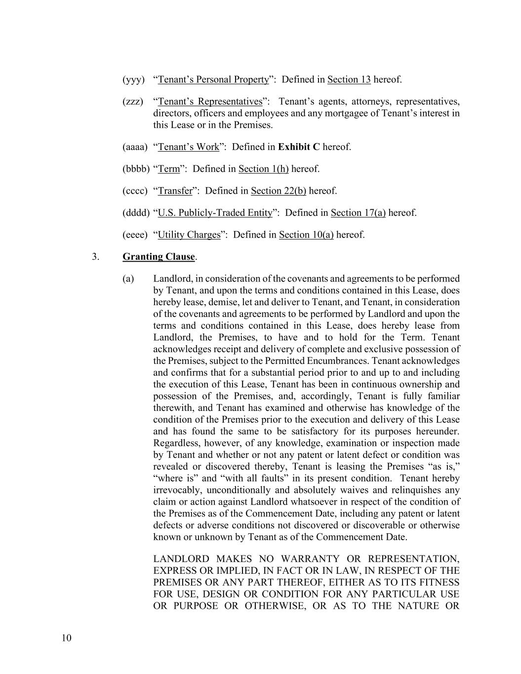 10 (yyy) “Tenant’s Personal Property”: Defined in Section 13 hereof. (zzz) “Tenant’s Representatives”: Tenant’s agents, attorneys, representatives, directors, officers and employees and any mortgagee of Tenant’s interest in this Lease or in the Premises. (aaaa) “Tenant’s Work”: Defined in Exhibit C hereof. (bbbb) “Term”: Defined in Section 1(h) hereof. (cccc) “Transfer”: Defined in Section 22(b) hereof. (dddd) “U.S. Publicly-Traded Entity”: Defined in Section 17(a) hereof. (eeee) “Utility Charges”: Defined in Section 10(a) hereof. 3. Granting Clause. (a) Landlord, in consideration of the covenants and agreements to be performed by Tenant, and upon the terms and conditions contained in this Lease, does hereby lease, demise, let and deliver to Tenant, and Tenant, in consideration of the covenants and agreements to be performed by Landlord and upon the terms and conditions contained in this Lease, does hereby lease from Landlord, the Premises, to have and to hold for the Term. Tenant acknowledges receipt and delivery of complete and exclusive possession of the Premises, subject to the Permitted Encumbrances. Tenant acknowledges and confirms that for a substantial period prior to and up to and including the execution of this Lease, Tenant has been in continuous ownership and possession of the Premises, and, accordingly, Tenant is fully familiar therewith, and Tenant has examined and otherwise has knowledge of the condition of the Premises prior to the execution and delivery of this Lease and has found the same to be satisfactory for its purposes hereunder. Regardless, however, of any knowledge, examination or inspection made by Tenant and whether or not any patent or latent defect or condition was revealed or discovered thereby, Tenant is leasing the Premises “as is,” “where is” and “with all faults” in its present condition. Tenant hereby irrevocably, unconditionally and absolutely waives and relinquishes any claim or action against Landlord whatsoever in respect of the condition of the Premises as of the Commencement Date, including any patent or latent defects or adverse conditions not discovered or discoverable or otherwise known or unknown by Tenant as of the Commencement Date. LANDLORD MAKES NO WARRANTY OR REPRESENTATION, EXPRESS OR IMPLIED, IN FACT OR IN LAW, IN RESPECT OF THE PREMISES OR ANY PART THEREOF, EITHER AS TO ITS FITNESS FOR USE, DESIGN OR CONDITION FOR ANY PARTICULAR USE OR PURPOSE OR OTHERWISE, OR AS TO THE NATURE OR