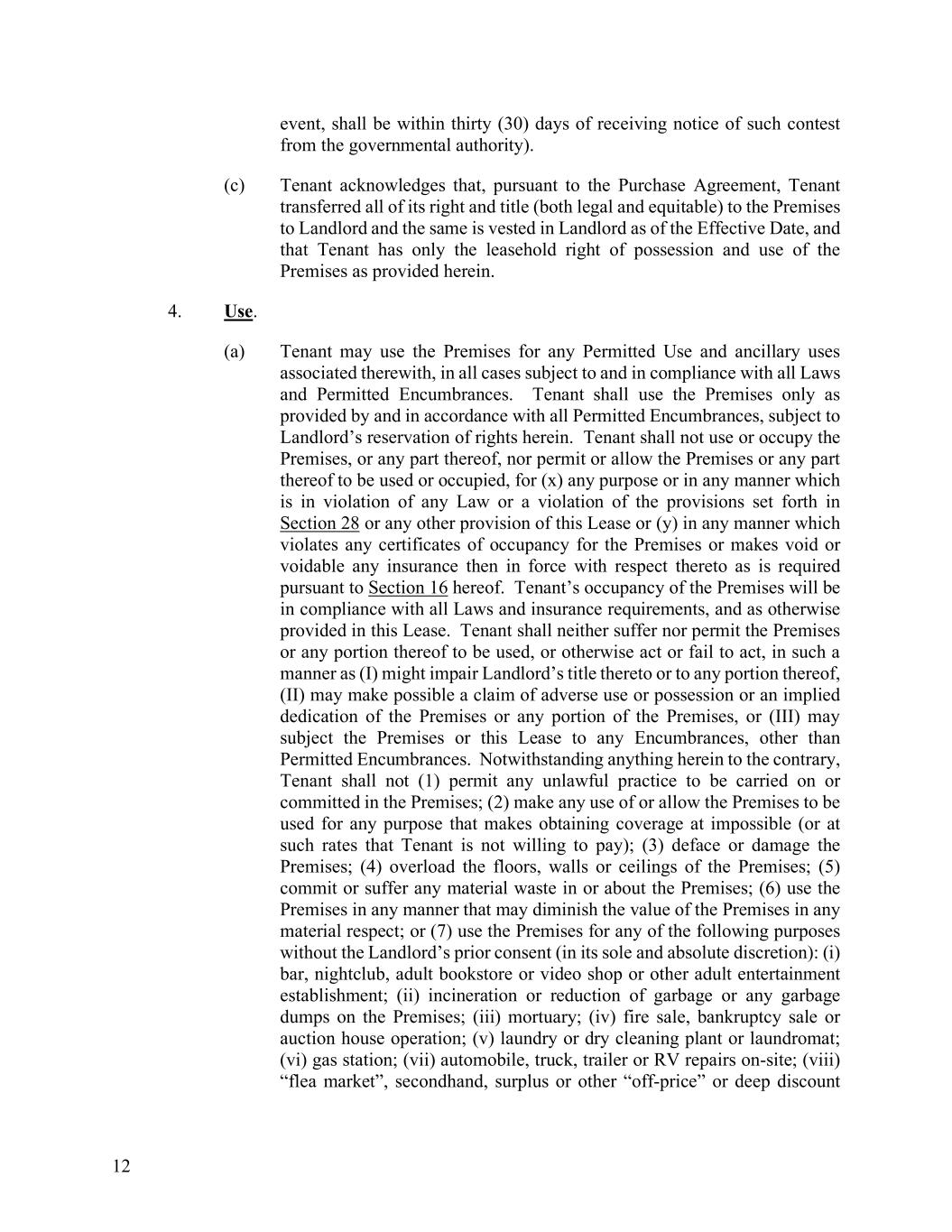 12 event, shall be within thirty (30) days of receiving notice of such contest from the governmental authority). (c) Tenant acknowledges that, pursuant to the Purchase Agreement, Tenant transferred all of its right and title (both legal and equitable) to the Premises to Landlord and the same is vested in Landlord as of the Effective Date, and that Tenant has only the leasehold right of possession and use of the Premises as provided herein. 4. Use. (a) Tenant may use the Premises for any Permitted Use and ancillary uses associated therewith, in all cases subject to and in compliance with all Laws and Permitted Encumbrances. Tenant shall use the Premises only as provided by and in accordance with all Permitted Encumbrances, subject to Landlord’s reservation of rights herein. Tenant shall not use or occupy the Premises, or any part thereof, nor permit or allow the Premises or any part thereof to be used or occupied, for (x) any purpose or in any manner which is in violation of any Law or a violation of the provisions set forth in Section 28 or any other provision of this Lease or (y) in any manner which violates any certificates of occupancy for the Premises or makes void or voidable any insurance then in force with respect thereto as is required pursuant to Section 16 hereof. Tenant’s occupancy of the Premises will be in compliance with all Laws and insurance requirements, and as otherwise provided in this Lease. Tenant shall neither suffer nor permit the Premises or any portion thereof to be used, or otherwise act or fail to act, in such a manner as (I) might impair Landlord’s title thereto or to any portion thereof, (II) may make possible a claim of adverse use or possession or an implied dedication of the Premises or any portion of the Premises, or (III) may subject the Premises or this Lease to any Encumbrances, other than Permitted Encumbrances. Notwithstanding anything herein to the contrary, Tenant shall not (1) permit any unlawful practice to be carried on or committed in the Premises; (2) make any use of or allow the Premises to be used for any purpose that makes obtaining coverage at impossible (or at such rates that Tenant is not willing to pay); (3) deface or damage the Premises; (4) overload the floors, walls or ceilings of the Premises; (5) commit or suffer any material waste in or about the Premises; (6) use the Premises in any manner that may diminish the value of the Premises in any material respect; or (7) use the Premises for any of the following purposes without the Landlord’s prior consent (in its sole and absolute discretion): (i) bar, nightclub, adult bookstore or video shop or other adult entertainment establishment; (ii) incineration or reduction of garbage or any garbage dumps on the Premises; (iii) mortuary; (iv) fire sale, bankruptcy sale or auction house operation; (v) laundry or dry cleaning plant or laundromat; (vi) gas station; (vii) automobile, truck, trailer or RV repairs on-site; (viii) “flea market”, secondhand, surplus or other “off-price” or deep discount
