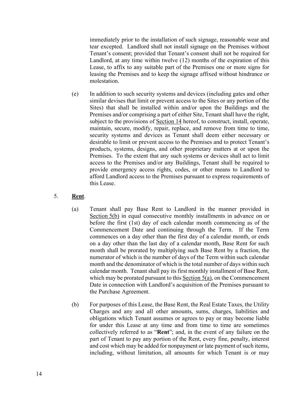 14 immediately prior to the installation of such signage, reasonable wear and tear excepted. Landlord shall not install signage on the Premises without Tenant’s consent; provided that Tenant’s consent shall not be required for Landlord, at any time within twelve (12) months of the expiration of this Lease, to affix to any suitable part of the Premises one or more signs for leasing the Premises and to keep the signage affixed without hindrance or molestation. (e) In addition to such security systems and devices (including gates and other similar devises that limit or prevent access to the Sites or any portion of the Sites) that shall be installed within and/or upon the Buildings and the Premises and/or comprising a part of either Site, Tenant shall have the right, subject to the provisions of Section 14 hereof, to construct, install, operate, maintain, secure, modify, repair, replace, and remove from time to time, security systems and devices as Tenant shall deem either necessary or desirable to limit or prevent access to the Premises and to protect Tenant’s products, systems, designs, and other proprietary matters at or upon the Premises. To the extent that any such systems or devices shall act to limit access to the Premises and/or any Buildings, Tenant shall be required to provide emergency access rights, codes, or other means to Landlord to afford Landlord access to the Premises pursuant to express requirements of this Lease. 5. Rent. (a) Tenant shall pay Base Rent to Landlord in the manner provided in Section 5(b) in equal consecutive monthly installments in advance on or before the first (1st) day of each calendar month commencing as of the Commencement Date and continuing through the Term. If the Term commences on a day other than the first day of a calendar month, or ends on a day other than the last day of a calendar month, Base Rent for such month shall be prorated by multiplying such Base Rent by a fraction, the numerator of which is the number of days of the Term within such calendar month and the denominator of which is the total number of days within such calendar month. Tenant shall pay its first monthly installment of Base Rent, which may be prorated pursuant to this Section 5(a), on the Commencement Date in connection with Landlord’s acquisition of the Premises pursuant to the Purchase Agreement. (b) For purposes of this Lease, the Base Rent, the Real Estate Taxes, the Utility Charges and any and all other amounts, sums, charges, liabilities and obligations which Tenant assumes or agrees to pay or may become liable for under this Lease at any time and from time to time are sometimes collectively referred to as “Rent”; and, in the event of any failure on the part of Tenant to pay any portion of the Rent, every fine, penalty, interest and cost which may be added for nonpayment or late payment of such items, including, without limitation, all amounts for which Tenant is or may
