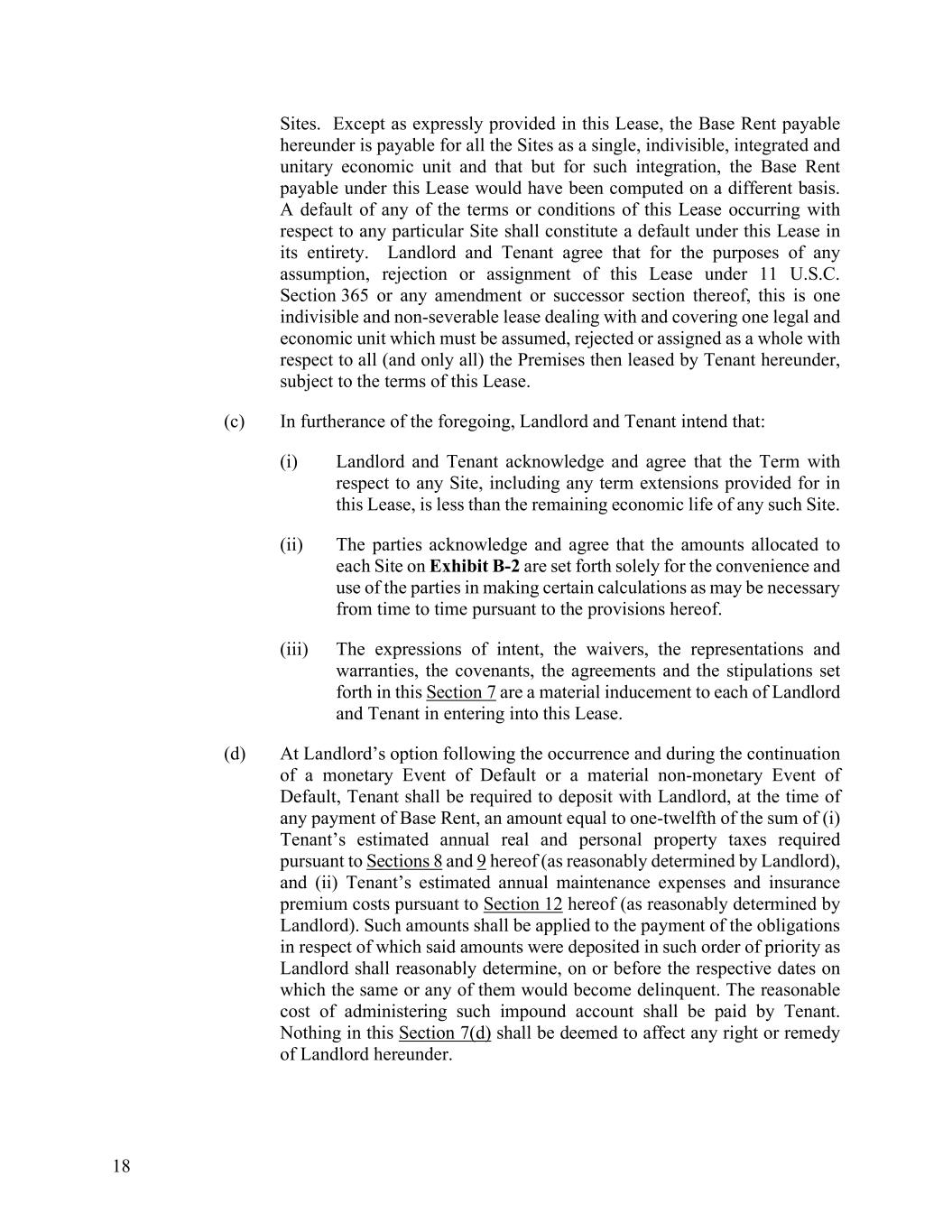 18 Sites. Except as expressly provided in this Lease, the Base Rent payable hereunder is payable for all the Sites as a single, indivisible, integrated and unitary economic unit and that but for such integration, the Base Rent payable under this Lease would have been computed on a different basis. A default of any of the terms or conditions of this Lease occurring with respect to any particular Site shall constitute a default under this Lease in its entirety. Landlord and Tenant agree that for the purposes of any assumption, rejection or assignment of this Lease under 11 U.S.C. Section 365 or any amendment or successor section thereof, this is one indivisible and non-severable lease dealing with and covering one legal and economic unit which must be assumed, rejected or assigned as a whole with respect to all (and only all) the Premises then leased by Tenant hereunder, subject to the terms of this Lease. (c) In furtherance of the foregoing, Landlord and Tenant intend that: (i) Landlord and Tenant acknowledge and agree that the Term with respect to any Site, including any term extensions provided for in this Lease, is less than the remaining economic life of any such Site. (ii) The parties acknowledge and agree that the amounts allocated to each Site on Exhibit B-2 are set forth solely for the convenience and use of the parties in making certain calculations as may be necessary from time to time pursuant to the provisions hereof. (iii) The expressions of intent, the waivers, the representations and warranties, the covenants, the agreements and the stipulations set forth in this Section 7 are a material inducement to each of Landlord and Tenant in entering into this Lease. (d) At Landlord’s option following the occurrence and during the continuation of a monetary Event of Default or a material non-monetary Event of Default, Tenant shall be required to deposit with Landlord, at the time of any payment of Base Rent, an amount equal to one-twelfth of the sum of (i) Tenant’s estimated annual real and personal property taxes required pursuant to Sections 8 and 9 hereof (as reasonably determined by Landlord), and (ii) Tenant’s estimated annual maintenance expenses and insurance premium costs pursuant to Section 12 hereof (as reasonably determined by Landlord). Such amounts shall be applied to the payment of the obligations in respect of which said amounts were deposited in such order of priority as Landlord shall reasonably determine, on or before the respective dates on which the same or any of them would become delinquent. The reasonable cost of administering such impound account shall be paid by Tenant. Nothing in this Section 7(d) shall be deemed to affect any right or remedy of Landlord hereunder.