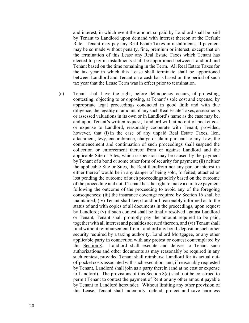 20 and interest, in which event the amount so paid by Landlord shall be paid by Tenant to Landlord upon demand with interest thereon at the Default Rate. Tenant may pay any Real Estate Taxes in installments, if payment may be so made without penalty, fine, premium or interest, except that on the termination of this Lease any Real Estate Taxes which Tenant has elected to pay in installments shall be apportioned between Landlord and Tenant based on the time remaining in the Term. All Real Estate Taxes for the tax year in which this Lease shall terminate shall be apportioned between Landlord and Tenant on a cash basis based on the period of such tax year that the Lease Term was in effect prior to termination. (c) Tenant shall have the right, before delinquency occurs, of protesting, contesting, objecting to or opposing, at Tenant’s sole cost and expense, by appropriate legal proceedings conducted in good faith and with due diligence, the legality or amount of any such Real Estate Taxes, assessments or assessed valuations in its own or in Landlord’s name as the case may be, and upon Tenant’s written request, Landlord will, at no out-of-pocket cost or expense to Landlord, reasonably cooperate with Tenant; provided, however, that (i) in the case of any unpaid Real Estate Taxes, lien, attachment, levy, encumbrance, charge or claim pursuant to any Law, the commencement and continuation of such proceedings shall suspend the collection or enforcement thereof from or against Landlord and the applicable Site or Sites, which suspension may be caused by the payment by Tenant of a bond or some other form of security for payment; (ii) neither the applicable Site or Sites, the Rent therefrom nor any part or interest in either thereof would be in any danger of being sold, forfeited, attached or lost pending the outcome of such proceedings solely based on the outcome of the proceeding and not if Tenant has the right to make a curative payment following the outcome of the proceeding to avoid any of the foregoing consequences; (iii) the insurance coverage required by Section 16 shall be maintained; (iv) Tenant shall keep Landlord reasonably informed as to the status of and with copies of all documents in the proceedings, upon request by Landlord; (v) if such contest shall be finally resolved against Landlord or Tenant, Tenant shall promptly pay the amount required to be paid, together with all interest and penalties accrued thereon, and (vi) Tenant shall fund without reimbursement from Landlord any bond, deposit or such other security required by a taxing authority, Landlord Mortgagee, or any other applicable party in connection with any protest or contest contemplated by this Section 8. Landlord shall execute and deliver to Tenant such authorizations and other documents as may reasonably be required in any such contest, provided Tenant shall reimburse Landlord for its actual out- of-pocket costs associated with such execution, and, if reasonably requested by Tenant, Landlord shall join as a party therein (and at no cost or expense to Landlord). The provisions of this Section 8(c) shall not be construed to permit Tenant to contest the payment of Rent or any other amount payable by Tenant to Landlord hereunder. Without limiting any other provision of this Lease, Tenant shall indemnify, defend, protect and save harmless