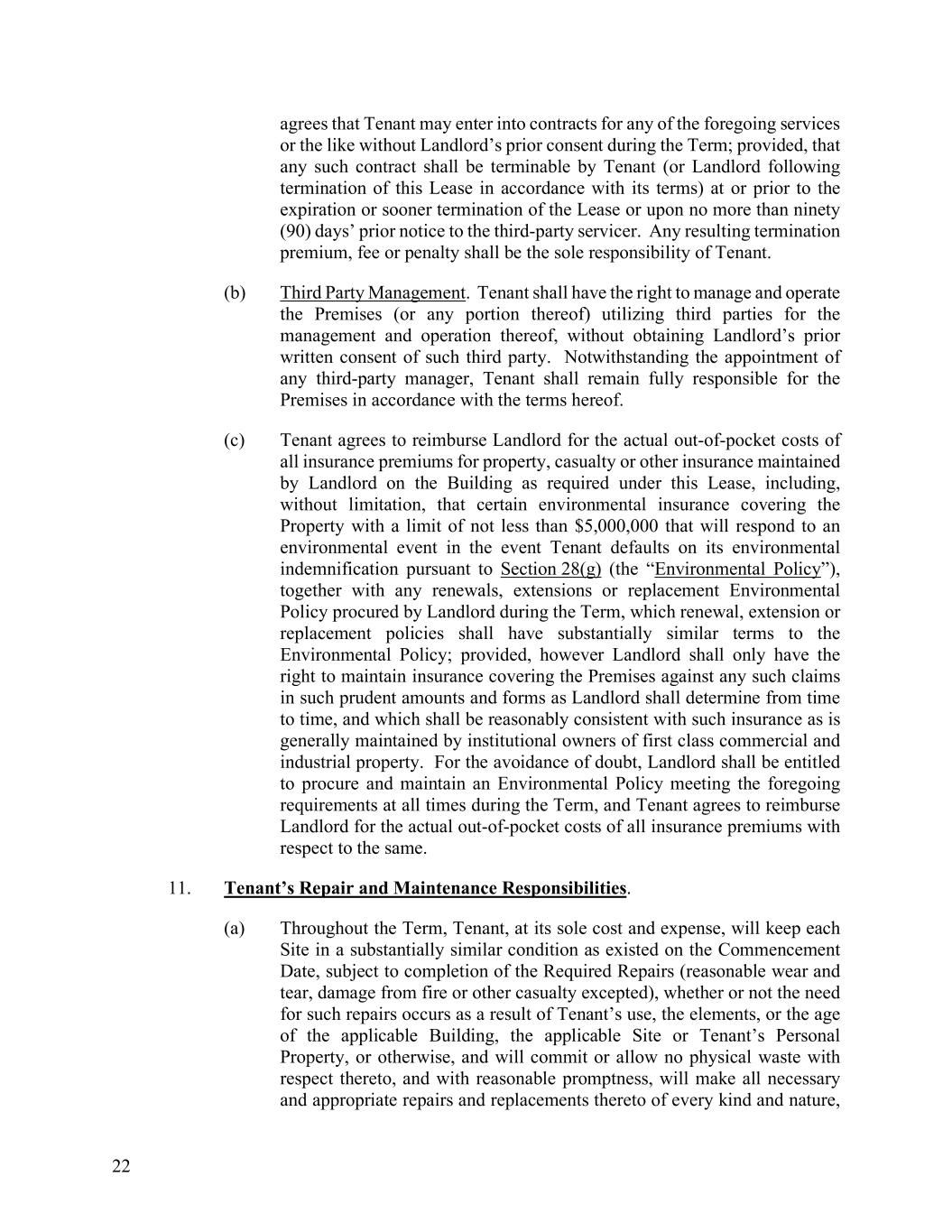 22 agrees that Tenant may enter into contracts for any of the foregoing services or the like without Landlord’s prior consent during the Term; provided, that any such contract shall be terminable by Tenant (or Landlord following termination of this Lease in accordance with its terms) at or prior to the expiration or sooner termination of the Lease or upon no more than ninety (90) days’ prior notice to the third-party servicer. Any resulting termination premium, fee or penalty shall be the sole responsibility of Tenant. (b) Third Party Management. Tenant shall have the right to manage and operate the Premises (or any portion thereof) utilizing third parties for the management and operation thereof, without obtaining Landlord’s prior written consent of such third party. Notwithstanding the appointment of any third-party manager, Tenant shall remain fully responsible for the Premises in accordance with the terms hereof. (c) Tenant agrees to reimburse Landlord for the actual out-of-pocket costs of all insurance premiums for property, casualty or other insurance maintained by Landlord on the Building as required under this Lease, including, without limitation, that certain environmental insurance covering the Property with a limit of not less than $5,000,000 that will respond to an environmental event in the event Tenant defaults on its environmental indemnification pursuant to Section 28(g) (the “Environmental Policy”), together with any renewals, extensions or replacement Environmental Policy procured by Landlord during the Term, which renewal, extension or replacement policies shall have substantially similar terms to the Environmental Policy; provided, however Landlord shall only have the right to maintain insurance covering the Premises against any such claims in such prudent amounts and forms as Landlord shall determine from time to time, and which shall be reasonably consistent with such insurance as is generally maintained by institutional owners of first class commercial and industrial property. For the avoidance of doubt, Landlord shall be entitled to procure and maintain an Environmental Policy meeting the foregoing requirements at all times during the Term, and Tenant agrees to reimburse Landlord for the actual out-of-pocket costs of all insurance premiums with respect to the same. 11. Tenant’s Repair and Maintenance Responsibilities. (a) Throughout the Term, Tenant, at its sole cost and expense, will keep each Site in a substantially similar condition as existed on the Commencement Date, subject to completion of the Required Repairs (reasonable wear and tear, damage from fire or other casualty excepted), whether or not the need for such repairs occurs as a result of Tenant’s use, the elements, or the age of the applicable Building, the applicable Site or Tenant’s Personal Property, or otherwise, and will commit or allow no physical waste with respect thereto, and with reasonable promptness, will make all necessary and appropriate repairs and replacements thereto of every kind and nature,