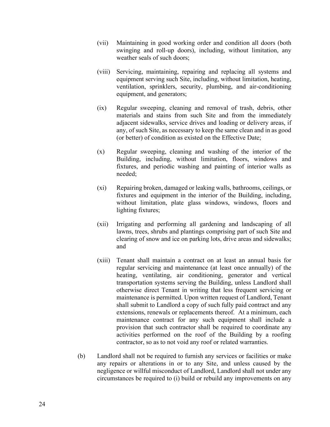 24 (vii) Maintaining in good working order and condition all doors (both swinging and roll-up doors), including, without limitation, any weather seals of such doors; (viii) Servicing, maintaining, repairing and replacing all systems and equipment serving such Site, including, without limitation, heating, ventilation, sprinklers, security, plumbing, and air-conditioning equipment, and generators; (ix) Regular sweeping, cleaning and removal of trash, debris, other materials and stains from such Site and from the immediately adjacent sidewalks, service drives and loading or delivery areas, if any, of such Site, as necessary to keep the same clean and in as good (or better) of condition as existed on the Effective Date; (x) Regular sweeping, cleaning and washing of the interior of the Building, including, without limitation, floors, windows and fixtures, and periodic washing and painting of interior walls as needed; (xi) Repairing broken, damaged or leaking walls, bathrooms, ceilings, or fixtures and equipment in the interior of the Building, including, without limitation, plate glass windows, windows, floors and lighting fixtures; (xii) Irrigating and performing all gardening and landscaping of all lawns, trees, shrubs and plantings comprising part of such Site and clearing of snow and ice on parking lots, drive areas and sidewalks; and (xiii) Tenant shall maintain a contract on at least an annual basis for regular servicing and maintenance (at least once annually) of the heating, ventilating, air conditioning, generator and vertical transportation systems serving the Building, unless Landlord shall otherwise direct Tenant in writing that less frequent servicing or maintenance is permitted. Upon written request of Landlord, Tenant shall submit to Landlord a copy of such fully paid contract and any extensions, renewals or replacements thereof. At a minimum, each maintenance contract for any such equipment shall include a provision that such contractor shall be required to coordinate any activities performed on the roof of the Building by a roofing contractor, so as to not void any roof or related warranties. (b) Landlord shall not be required to furnish any services or facilities or make any repairs or alterations in or to any Site, and unless caused by the negligence or willful misconduct of Landlord, Landlord shall not under any circumstances be required to (i) build or rebuild any improvements on any