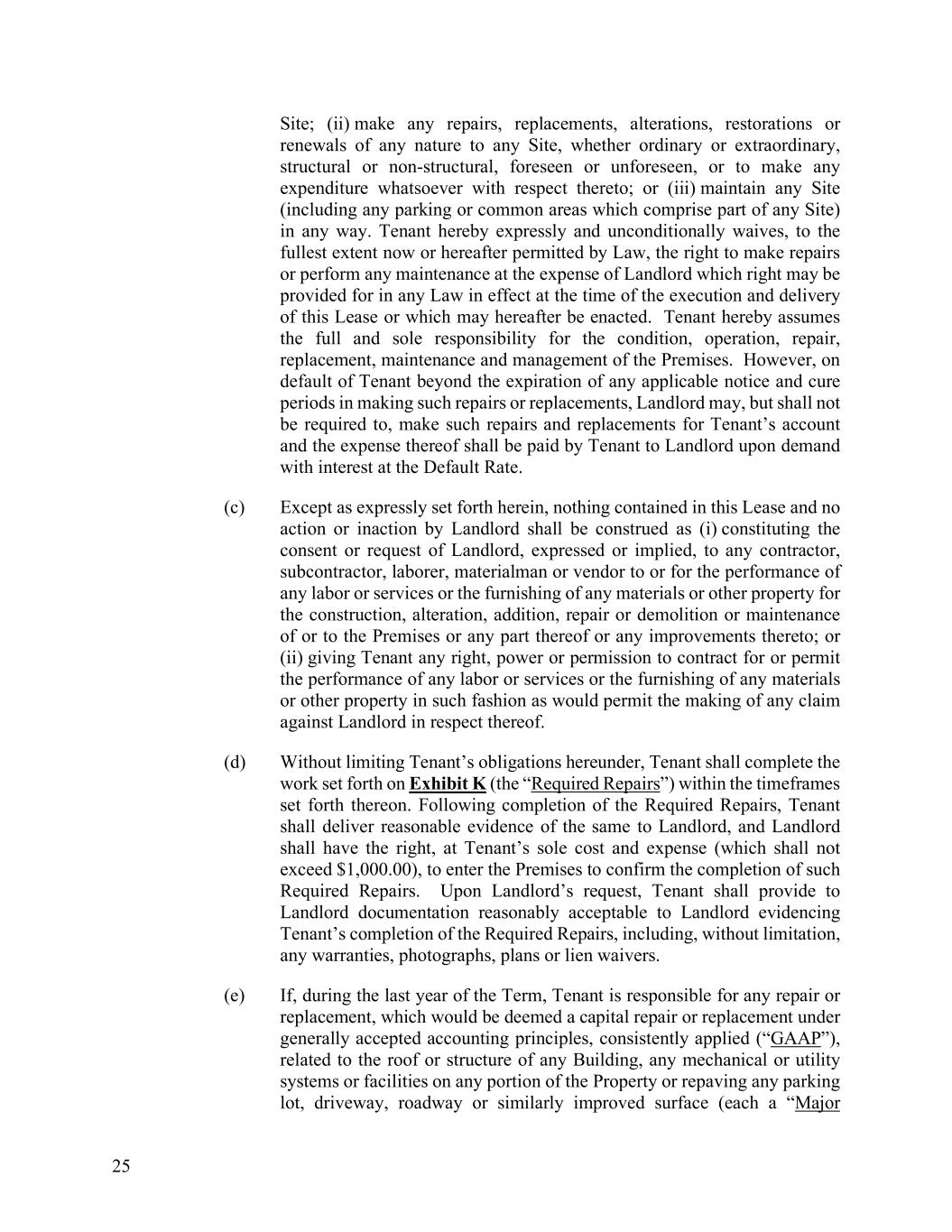 25 Site; (ii) make any repairs, replacements, alterations, restorations or renewals of any nature to any Site, whether ordinary or extraordinary, structural or non-structural, foreseen or unforeseen, or to make any expenditure whatsoever with respect thereto; or (iii) maintain any Site (including any parking or common areas which comprise part of any Site) in any way. Tenant hereby expressly and unconditionally waives, to the fullest extent now or hereafter permitted by Law, the right to make repairs or perform any maintenance at the expense of Landlord which right may be provided for in any Law in effect at the time of the execution and delivery of this Lease or which may hereafter be enacted. Tenant hereby assumes the full and sole responsibility for the condition, operation, repair, replacement, maintenance and management of the Premises. However, on default of Tenant beyond the expiration of any applicable notice and cure periods in making such repairs or replacements, Landlord may, but shall not be required to, make such repairs and replacements for Tenant’s account and the expense thereof shall be paid by Tenant to Landlord upon demand with interest at the Default Rate. (c) Except as expressly set forth herein, nothing contained in this Lease and no action or inaction by Landlord shall be construed as (i) constituting the consent or request of Landlord, expressed or implied, to any contractor, subcontractor, laborer, materialman or vendor to or for the performance of any labor or services or the furnishing of any materials or other property for the construction, alteration, addition, repair or demolition or maintenance of or to the Premises or any part thereof or any improvements thereto; or (ii) giving Tenant any right, power or permission to contract for or permit the performance of any labor or services or the furnishing of any materials or other property in such fashion as would permit the making of any claim against Landlord in respect thereof. (d) Without limiting Tenant’s obligations hereunder, Tenant shall complete the work set forth on Exhibit K (the “Required Repairs”) within the timeframes set forth thereon. Following completion of the Required Repairs, Tenant shall deliver reasonable evidence of the same to Landlord, and Landlord shall have the right, at Tenant’s sole cost and expense (which shall not exceed $1,000.00), to enter the Premises to confirm the completion of such Required Repairs. Upon Landlord’s request, Tenant shall provide to Landlord documentation reasonably acceptable to Landlord evidencing Tenant’s completion of the Required Repairs, including, without limitation, any warranties, photographs, plans or lien waivers. (e) If, during the last year of the Term, Tenant is responsible for any repair or replacement, which would be deemed a capital repair or replacement under generally accepted accounting principles, consistently applied (“GAAP”), related to the roof or structure of any Building, any mechanical or utility systems or facilities on any portion of the Property or repaving any parking lot, driveway, roadway or similarly improved surface (each a “Major
