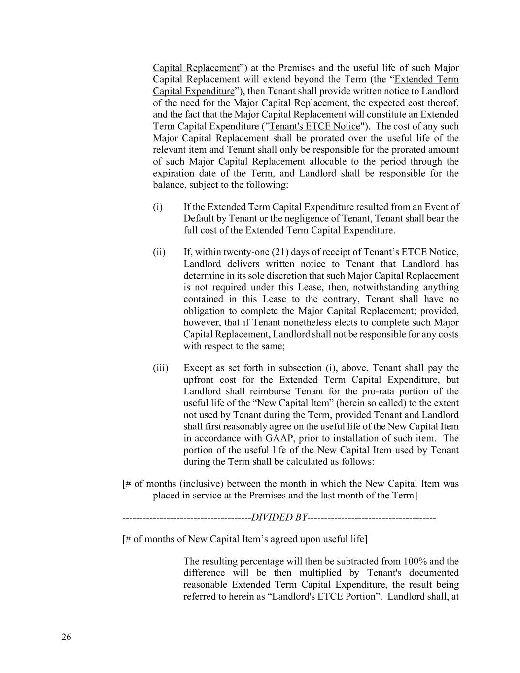 26 Capital Replacement”) at the Premises and the useful life of such Major Capital Replacement will extend beyond the Term (the “Extended Term Capital Expenditure”), then Tenant shall provide written notice to Landlord of the need for the Major Capital Replacement, the expected cost thereof, and the fact that the Major Capital Replacement will constitute an Extended Term Capital Expenditure ("Tenant's ETCE Notice"). The cost of any such Major Capital Replacement shall be prorated over the useful life of the relevant item and Tenant shall only be responsible for the prorated amount of such Major Capital Replacement allocable to the period through the expiration date of the Term, and Landlord shall be responsible for the balance, subject to the following: (i) If the Extended Term Capital Expenditure resulted from an Event of Default by Tenant or the negligence of Tenant, Tenant shall bear the full cost of the Extended Term Capital Expenditure. (ii) If, within twenty-one (21) days of receipt of Tenant’s ETCE Notice, Landlord delivers written notice to Tenant that Landlord has determine in its sole discretion that such Major Capital Replacement is not required under this Lease, then, notwithstanding anything contained in this Lease to the contrary, Tenant shall have no obligation to complete the Major Capital Replacement; provided, however, that if Tenant nonetheless elects to complete such Major Capital Replacement, Landlord shall not be responsible for any costs with respect to the same; (iii) Except as set forth in subsection (i), above, Tenant shall pay the upfront cost for the Extended Term Capital Expenditure, but Landlord shall reimburse Tenant for the pro-rata portion of the useful life of the “New Capital Item” (herein so called) to the extent not used by Tenant during the Term, provided Tenant and Landlord shall first reasonably agree on the useful life of the New Capital Item in accordance with GAAP, prior to installation of such item. The portion of the useful life of the New Capital Item used by Tenant during the Term shall be calculated as follows: [# of months (inclusive) between the month in which the New Capital Item was placed in service at the Premises and the last month of the Term] --------------------------------------DIVIDED BY-------------------------------------- [# of months of New Capital Item’s agreed upon useful life] The resulting percentage will then be subtracted from 100% and the difference will be then multiplied by Tenant's documented reasonable Extended Term Capital Expenditure, the result being referred to herein as “Landlord's ETCE Portion”. Landlord shall, at