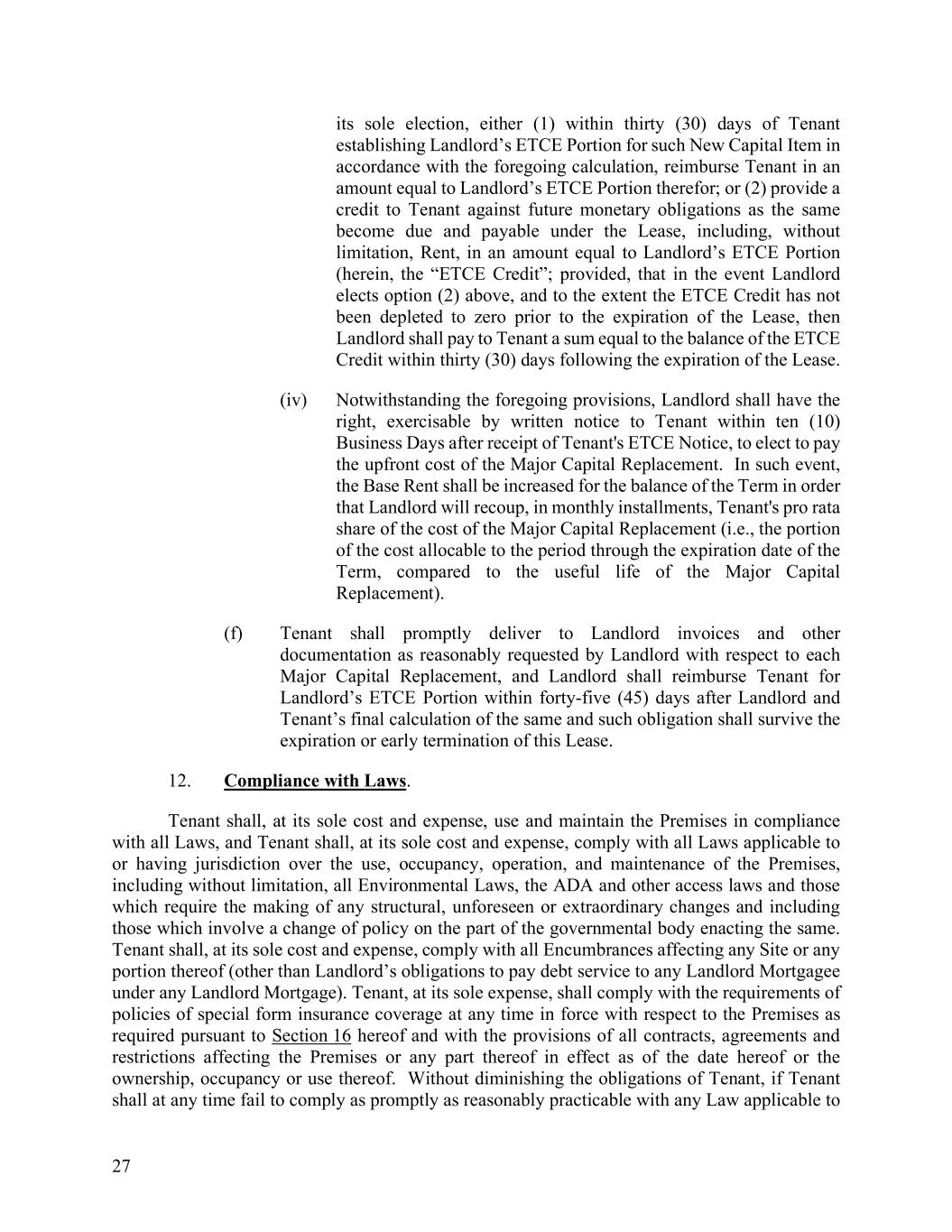 27 its sole election, either (1) within thirty (30) days of Tenant establishing Landlord’s ETCE Portion for such New Capital Item in accordance with the foregoing calculation, reimburse Tenant in an amount equal to Landlord’s ETCE Portion therefor; or (2) provide a credit to Tenant against future monetary obligations as the same become due and payable under the Lease, including, without limitation, Rent, in an amount equal to Landlord’s ETCE Portion (herein, the “ETCE Credit”; provided, that in the event Landlord elects option (2) above, and to the extent the ETCE Credit has not been depleted to zero prior to the expiration of the Lease, then Landlord shall pay to Tenant a sum equal to the balance of the ETCE Credit within thirty (30) days following the expiration of the Lease. (iv) Notwithstanding the foregoing provisions, Landlord shall have the right, exercisable by written notice to Tenant within ten (10) Business Days after receipt of Tenant's ETCE Notice, to elect to pay the upfront cost of the Major Capital Replacement. In such event, the Base Rent shall be increased for the balance of the Term in order that Landlord will recoup, in monthly installments, Tenant's pro rata share of the cost of the Major Capital Replacement (i.e., the portion of the cost allocable to the period through the expiration date of the Term, compared to the useful life of the Major Capital Replacement). (f) Tenant shall promptly deliver to Landlord invoices and other documentation as reasonably requested by Landlord with respect to each Major Capital Replacement, and Landlord shall reimburse Tenant for Landlord’s ETCE Portion within forty-five (45) days after Landlord and Tenant’s final calculation of the same and such obligation shall survive the expiration or early termination of this Lease. 12. Compliance with Laws. Tenant shall, at its sole cost and expense, use and maintain the Premises in compliance with all Laws, and Tenant shall, at its sole cost and expense, comply with all Laws applicable to or having jurisdiction over the use, occupancy, operation, and maintenance of the Premises, including without limitation, all Environmental Laws, the ADA and other access laws and those which require the making of any structural, unforeseen or extraordinary changes and including those which involve a change of policy on the part of the governmental body enacting the same. Tenant shall, at its sole cost and expense, comply with all Encumbrances affecting any Site or any portion thereof (other than Landlord’s obligations to pay debt service to any Landlord Mortgagee under any Landlord Mortgage). Tenant, at its sole expense, shall comply with the requirements of policies of special form insurance coverage at any time in force with respect to the Premises as required pursuant to Section 16 hereof and with the provisions of all contracts, agreements and restrictions affecting the Premises or any part thereof in effect as of the date hereof or the ownership, occupancy or use thereof. Without diminishing the obligations of Tenant, if Tenant shall at any time fail to comply as promptly as reasonably practicable with any Law applicable to