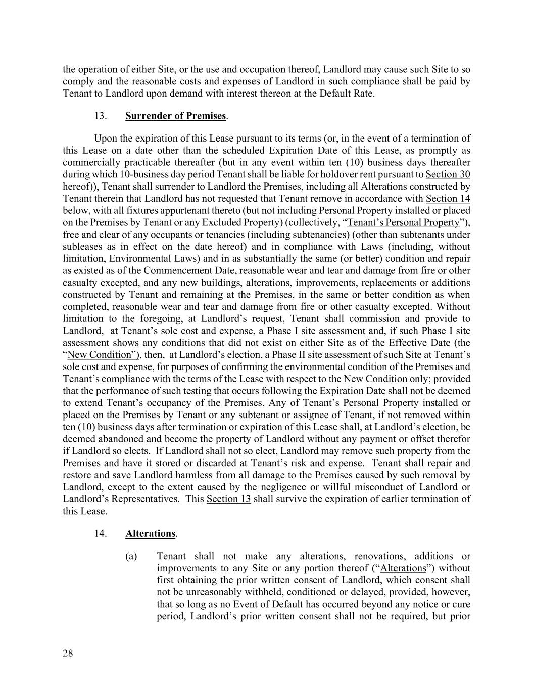 28 the operation of either Site, or the use and occupation thereof, Landlord may cause such Site to so comply and the reasonable costs and expenses of Landlord in such compliance shall be paid by Tenant to Landlord upon demand with interest thereon at the Default Rate. 13. Surrender of Premises. Upon the expiration of this Lease pursuant to its terms (or, in the event of a termination of this Lease on a date other than the scheduled Expiration Date of this Lease, as promptly as commercially practicable thereafter (but in any event within ten (10) business days thereafter during which 10-business day period Tenant shall be liable for holdover rent pursuant to Section 30 hereof)), Tenant shall surrender to Landlord the Premises, including all Alterations constructed by Tenant therein that Landlord has not requested that Tenant remove in accordance with Section 14 below, with all fixtures appurtenant thereto (but not including Personal Property installed or placed on the Premises by Tenant or any Excluded Property) (collectively, “Tenant’s Personal Property”), free and clear of any occupants or tenancies (including subtenancies) (other than subtenants under subleases as in effect on the date hereof) and in compliance with Laws (including, without limitation, Environmental Laws) and in as substantially the same (or better) condition and repair as existed as of the Commencement Date, reasonable wear and tear and damage from fire or other casualty excepted, and any new buildings, alterations, improvements, replacements or additions constructed by Tenant and remaining at the Premises, in the same or better condition as when completed, reasonable wear and tear and damage from fire or other casualty excepted. Without limitation to the foregoing, at Landlord’s request, Tenant shall commission and provide to Landlord, at Tenant’s sole cost and expense, a Phase I site assessment and, if such Phase I site assessment shows any conditions that did not exist on either Site as of the Effective Date (the “New Condition”), then, at Landlord’s election, a Phase II site assessment of such Site at Tenant’s sole cost and expense, for purposes of confirming the environmental condition of the Premises and Tenant’s compliance with the terms of the Lease with respect to the New Condition only; provided that the performance of such testing that occurs following the Expiration Date shall not be deemed to extend Tenant’s occupancy of the Premises. Any of Tenant’s Personal Property installed or placed on the Premises by Tenant or any subtenant or assignee of Tenant, if not removed within ten (10) business days after termination or expiration of this Lease shall, at Landlord’s election, be deemed abandoned and become the property of Landlord without any payment or offset therefor if Landlord so elects. If Landlord shall not so elect, Landlord may remove such property from the Premises and have it stored or discarded at Tenant’s risk and expense. Tenant shall repair and restore and save Landlord harmless from all damage to the Premises caused by such removal by Landlord, except to the extent caused by the negligence or willful misconduct of Landlord or Landlord’s Representatives. This Section 13 shall survive the expiration of earlier termination of this Lease. 14. Alterations. (a) Tenant shall not make any alterations, renovations, additions or improvements to any Site or any portion thereof (“Alterations”) without first obtaining the prior written consent of Landlord, which consent shall not be unreasonably withheld, conditioned or delayed, provided, however, that so long as no Event of Default has occurred beyond any notice or cure period, Landlord’s prior written consent shall not be required, but prior