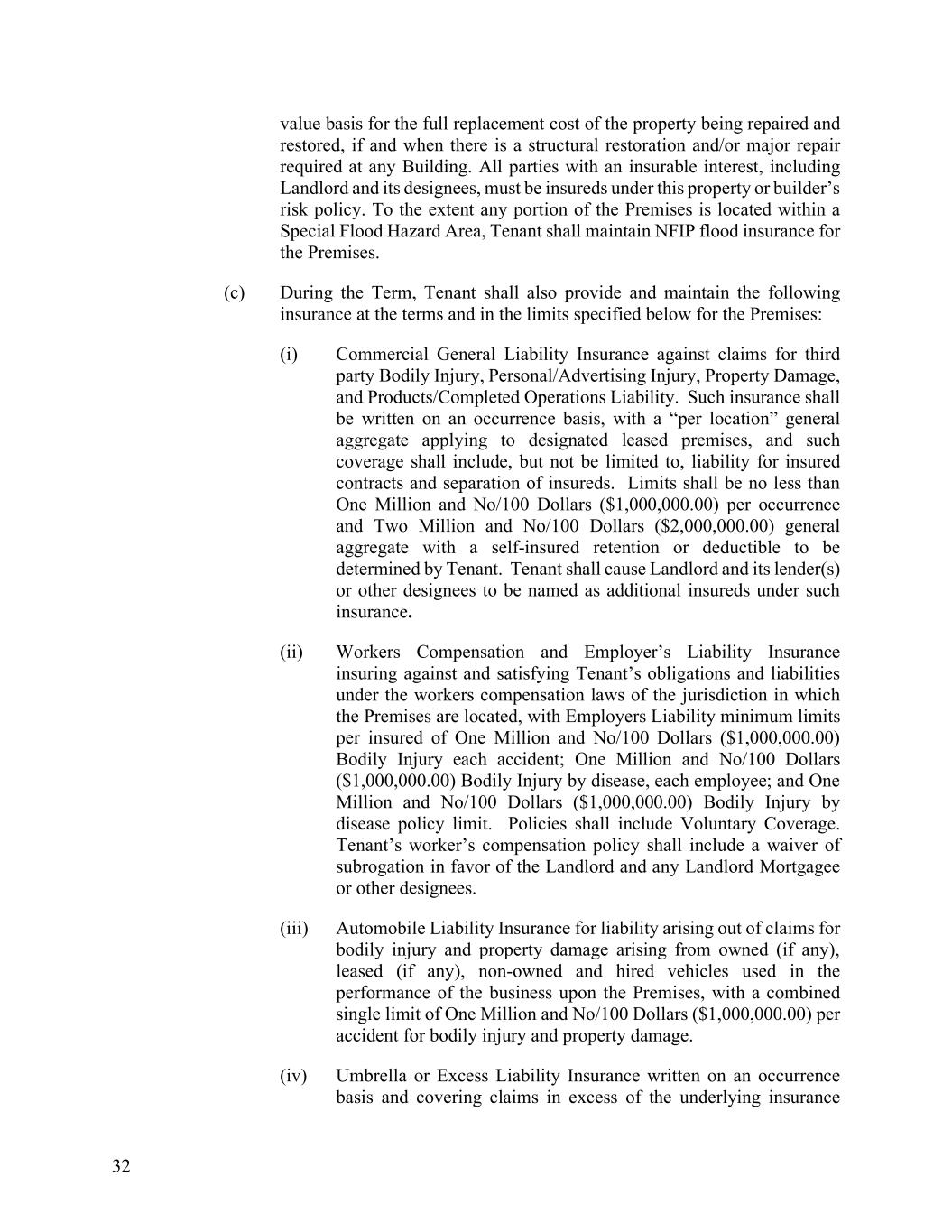 32 value basis for the full replacement cost of the property being repaired and restored, if and when there is a structural restoration and/or major repair required at any Building. All parties with an insurable interest, including Landlord and its designees, must be insureds under this property or builder’s risk policy. To the extent any portion of the Premises is located within a Special Flood Hazard Area, Tenant shall maintain NFIP flood insurance for the Premises. (c) During the Term, Tenant shall also provide and maintain the following insurance at the terms and in the limits specified below for the Premises: (i) Commercial General Liability Insurance against claims for third party Bodily Injury, Personal/Advertising Injury, Property Damage, and Products/Completed Operations Liability. Such insurance shall be written on an occurrence basis, with a “per location” general aggregate applying to designated leased premises, and such coverage shall include, but not be limited to, liability for insured contracts and separation of insureds. Limits shall be no less than One Million and No/100 Dollars ($1,000,000.00) per occurrence and Two Million and No/100 Dollars ($2,000,000.00) general aggregate with a self-insured retention or deductible to be determined by Tenant. Tenant shall cause Landlord and its lender(s) or other designees to be named as additional insureds under such insurance. (ii) Workers Compensation and Employer’s Liability Insurance insuring against and satisfying Tenant’s obligations and liabilities under the workers compensation laws of the jurisdiction in which the Premises are located, with Employers Liability minimum limits per insured of One Million and No/100 Dollars ($1,000,000.00) Bodily Injury each accident; One Million and No/100 Dollars ($1,000,000.00) Bodily Injury by disease, each employee; and One Million and No/100 Dollars ($1,000,000.00) Bodily Injury by disease policy limit. Policies shall include Voluntary Coverage. Tenant’s worker’s compensation policy shall include a waiver of subrogation in favor of the Landlord and any Landlord Mortgagee or other designees. (iii) Automobile Liability Insurance for liability arising out of claims for bodily injury and property damage arising from owned (if any), leased (if any), non-owned and hired vehicles used in the performance of the business upon the Premises, with a combined single limit of One Million and No/100 Dollars ($1,000,000.00) per accident for bodily injury and property damage. (iv) Umbrella or Excess Liability Insurance written on an occurrence basis and covering claims in excess of the underlying insurance