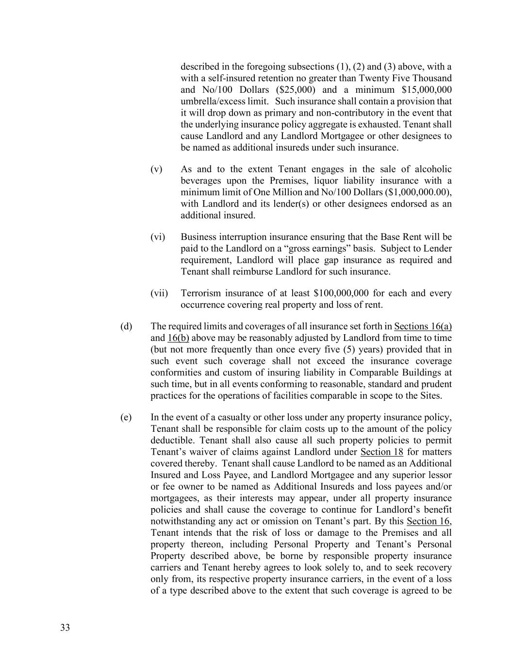 33 described in the foregoing subsections (1), (2) and (3) above, with a with a self-insured retention no greater than Twenty Five Thousand and No/100 Dollars ($25,000) and a minimum $15,000,000 umbrella/excess limit. Such insurance shall contain a provision that it will drop down as primary and non-contributory in the event that the underlying insurance policy aggregate is exhausted. Tenant shall cause Landlord and any Landlord Mortgagee or other designees to be named as additional insureds under such insurance. (v) As and to the extent Tenant engages in the sale of alcoholic beverages upon the Premises, liquor liability insurance with a minimum limit of One Million and No/100 Dollars ($1,000,000.00), with Landlord and its lender(s) or other designees endorsed as an additional insured. (vi) Business interruption insurance ensuring that the Base Rent will be paid to the Landlord on a “gross earnings” basis. Subject to Lender requirement, Landlord will place gap insurance as required and Tenant shall reimburse Landlord for such insurance. (vii) Terrorism insurance of at least $100,000,000 for each and every occurrence covering real property and loss of rent. (d) The required limits and coverages of all insurance set forth in Sections 16(a) and 16(b) above may be reasonably adjusted by Landlord from time to time (but not more frequently than once every five (5) years) provided that in such event such coverage shall not exceed the insurance coverage conformities and custom of insuring liability in Comparable Buildings at such time, but in all events conforming to reasonable, standard and prudent practices for the operations of facilities comparable in scope to the Sites. (e) In the event of a casualty or other loss under any property insurance policy, Tenant shall be responsible for claim costs up to the amount of the policy deductible. Tenant shall also cause all such property policies to permit Tenant’s waiver of claims against Landlord under Section 18 for matters covered thereby. Tenant shall cause Landlord to be named as an Additional Insured and Loss Payee, and Landlord Mortgagee and any superior lessor or fee owner to be named as Additional Insureds and loss payees and/or mortgagees, as their interests may appear, under all property insurance policies and shall cause the coverage to continue for Landlord’s benefit notwithstanding any act or omission on Tenant’s part. By this Section 16, Tenant intends that the risk of loss or damage to the Premises and all property thereon, including Personal Property and Tenant’s Personal Property described above, be borne by responsible property insurance carriers and Tenant hereby agrees to look solely to, and to seek recovery only from, its respective property insurance carriers, in the event of a loss of a type described above to the extent that such coverage is agreed to be