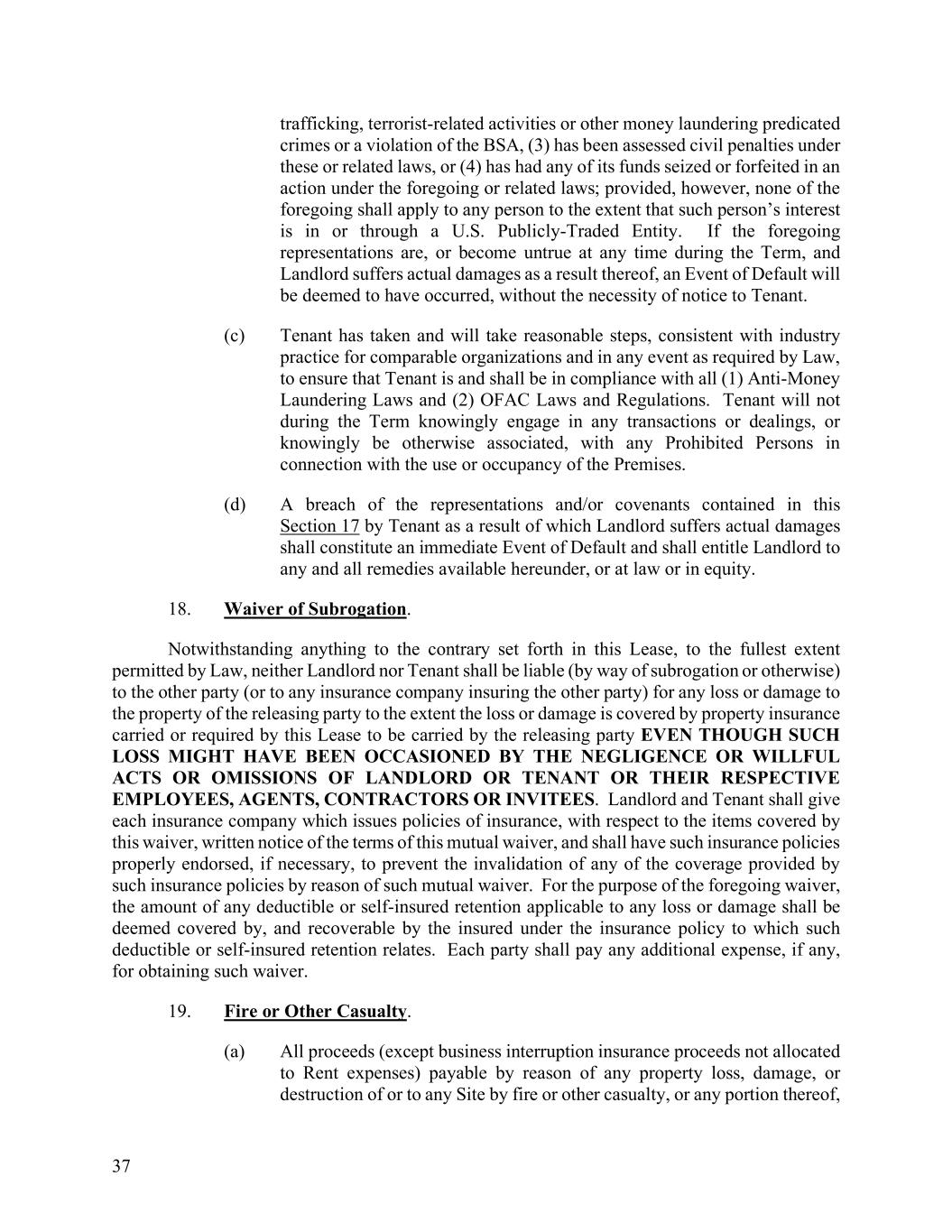 37 trafficking, terrorist-related activities or other money laundering predicated crimes or a violation of the BSA, (3) has been assessed civil penalties under these or related laws, or (4) has had any of its funds seized or forfeited in an action under the foregoing or related laws; provided, however, none of the foregoing shall apply to any person to the extent that such person’s interest is in or through a U.S. Publicly-Traded Entity. If the foregoing representations are, or become untrue at any time during the Term, and Landlord suffers actual damages as a result thereof, an Event of Default will be deemed to have occurred, without the necessity of notice to Tenant. (c) Tenant has taken and will take reasonable steps, consistent with industry practice for comparable organizations and in any event as required by Law, to ensure that Tenant is and shall be in compliance with all (1) Anti-Money Laundering Laws and (2) OFAC Laws and Regulations. Tenant will not during the Term knowingly engage in any transactions or dealings, or knowingly be otherwise associated, with any Prohibited Persons in connection with the use or occupancy of the Premises. (d) A breach of the representations and/or covenants contained in this Section 17 by Tenant as a result of which Landlord suffers actual damages shall constitute an immediate Event of Default and shall entitle Landlord to any and all remedies available hereunder, or at law or in equity. 18. Waiver of Subrogation. Notwithstanding anything to the contrary set forth in this Lease, to the fullest extent permitted by Law, neither Landlord nor Tenant shall be liable (by way of subrogation or otherwise) to the other party (or to any insurance company insuring the other party) for any loss or damage to the property of the releasing party to the extent the loss or damage is covered by property insurance carried or required by this Lease to be carried by the releasing party EVEN THOUGH SUCH LOSS MIGHT HAVE BEEN OCCASIONED BY THE NEGLIGENCE OR WILLFUL ACTS OR OMISSIONS OF LANDLORD OR TENANT OR THEIR RESPECTIVE EMPLOYEES, AGENTS, CONTRACTORS OR INVITEES. Landlord and Tenant shall give each insurance company which issues policies of insurance, with respect to the items covered by this waiver, written notice of the terms of this mutual waiver, and shall have such insurance policies properly endorsed, if necessary, to prevent the invalidation of any of the coverage provided by such insurance policies by reason of such mutual waiver. For the purpose of the foregoing waiver, the amount of any deductible or self-insured retention applicable to any loss or damage shall be deemed covered by, and recoverable by the insured under the insurance policy to which such deductible or self-insured retention relates. Each party shall pay any additional expense, if any, for obtaining such waiver. 19. Fire or Other Casualty. (a) All proceeds (except business interruption insurance proceeds not allocated to Rent expenses) payable by reason of any property loss, damage, or destruction of or to any Site by fire or other casualty, or any portion thereof,