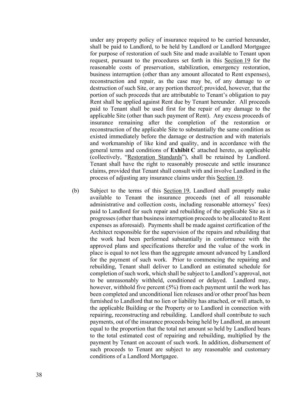 38 under any property policy of insurance required to be carried hereunder, shall be paid to Landlord, to be held by Landlord or Landlord Mortgagee for purpose of restoration of such Site and made available to Tenant upon request, pursuant to the procedures set forth in this Section 19 for the reasonable costs of preservation, stabilization, emergency restoration, business interruption (other than any amount allocated to Rent expenses), reconstruction and repair, as the case may be, of any damage to or destruction of such Site, or any portion thereof; provided, however, that the portion of such proceeds that are attributable to Tenant’s obligation to pay Rent shall be applied against Rent due by Tenant hereunder. All proceeds paid to Tenant shall be used first for the repair of any damage to the applicable Site (other than such payment of Rent). Any excess proceeds of insurance remaining after the completion of the restoration or reconstruction of the applicable Site to substantially the same condition as existed immediately before the damage or destruction and with materials and workmanship of like kind and quality, and in accordance with the general terms and conditions of Exhibit C attached hereto, as applicable (collectively, “Restoration Standards”), shall be retained by Landlord. Tenant shall have the right to reasonably prosecute and settle insurance claims, provided that Tenant shall consult with and involve Landlord in the process of adjusting any insurance claims under this Section 19. (b) Subject to the terms of this Section 19, Landlord shall promptly make available to Tenant the insurance proceeds (net of all reasonable administrative and collection costs, including reasonable attorneys’ fees) paid to Landlord for such repair and rebuilding of the applicable Site as it progresses (other than business interruption proceeds to be allocated to Rent expenses as aforesaid). Payments shall be made against certification of the Architect responsible for the supervision of the repairs and rebuilding that the work had been performed substantially in conformance with the approved plans and specifications therefor and the value of the work in place is equal to not less than the aggregate amount advanced by Landlord for the payment of such work. Prior to commencing the repairing and rebuilding, Tenant shall deliver to Landlord an estimated schedule for completion of such work, which shall be subject to Landlord’s approval, not to be unreasonably withheld, conditioned or delayed. Landlord may, however, withhold five percent (5%) from each payment until the work has been completed and unconditional lien releases and/or other proof has been furnished to Landlord that no lien or liability has attached, or will attach, to the applicable Building or the Property or to Landlord in connection with repairing, reconstructing and rebuilding. Landlord shall contribute to such payments, out of the insurance proceeds being held by Landlord, an amount equal to the proportion that the total net amount so held by Landlord bears to the total estimated cost of repairing and rebuilding, multiplied by the payment by Tenant on account of such work. In addition, disbursement of such proceeds to Tenant are subject to any reasonable and customary conditions of a Landlord Mortgagee.