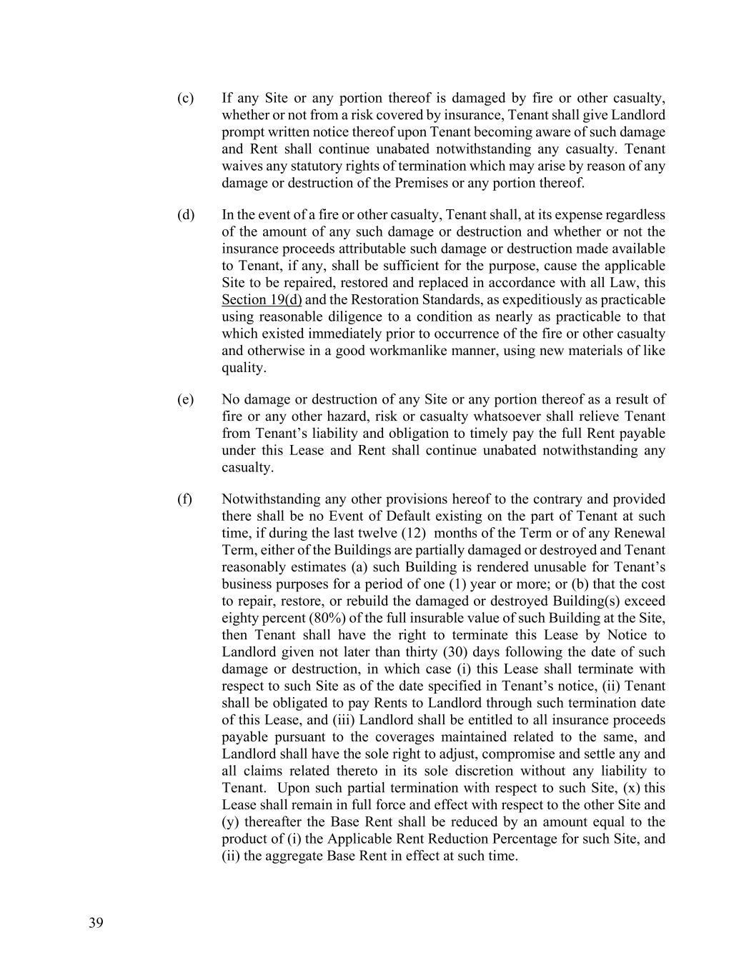 39 (c) If any Site or any portion thereof is damaged by fire or other casualty, whether or not from a risk covered by insurance, Tenant shall give Landlord prompt written notice thereof upon Tenant becoming aware of such damage and Rent shall continue unabated notwithstanding any casualty. Tenant waives any statutory rights of termination which may arise by reason of any damage or destruction of the Premises or any portion thereof. (d) In the event of a fire or other casualty, Tenant shall, at its expense regardless of the amount of any such damage or destruction and whether or not the insurance proceeds attributable such damage or destruction made available to Tenant, if any, shall be sufficient for the purpose, cause the applicable Site to be repaired, restored and replaced in accordance with all Law, this Section 19(d) and the Restoration Standards, as expeditiously as practicable using reasonable diligence to a condition as nearly as practicable to that which existed immediately prior to occurrence of the fire or other casualty and otherwise in a good workmanlike manner, using new materials of like quality. (e) No damage or destruction of any Site or any portion thereof as a result of fire or any other hazard, risk or casualty whatsoever shall relieve Tenant from Tenant’s liability and obligation to timely pay the full Rent payable under this Lease and Rent shall continue unabated notwithstanding any casualty. (f) Notwithstanding any other provisions hereof to the contrary and provided there shall be no Event of Default existing on the part of Tenant at such time, if during the last twelve (12) months of the Term or of any Renewal Term, either of the Buildings are partially damaged or destroyed and Tenant reasonably estimates (a) such Building is rendered unusable for Tenant’s business purposes for a period of one (1) year or more; or (b) that the cost to repair, restore, or rebuild the damaged or destroyed Building(s) exceed eighty percent (80%) of the full insurable value of such Building at the Site, then Tenant shall have the right to terminate this Lease by Notice to Landlord given not later than thirty (30) days following the date of such damage or destruction, in which case (i) this Lease shall terminate with respect to such Site as of the date specified in Tenant’s notice, (ii) Tenant shall be obligated to pay Rents to Landlord through such termination date of this Lease, and (iii) Landlord shall be entitled to all insurance proceeds payable pursuant to the coverages maintained related to the same, and Landlord shall have the sole right to adjust, compromise and settle any and all claims related thereto in its sole discretion without any liability to Tenant. Upon such partial termination with respect to such Site, (x) this Lease shall remain in full force and effect with respect to the other Site and (y) thereafter the Base Rent shall be reduced by an amount equal to the product of (i) the Applicable Rent Reduction Percentage for such Site, and (ii) the aggregate Base Rent in effect at such time.