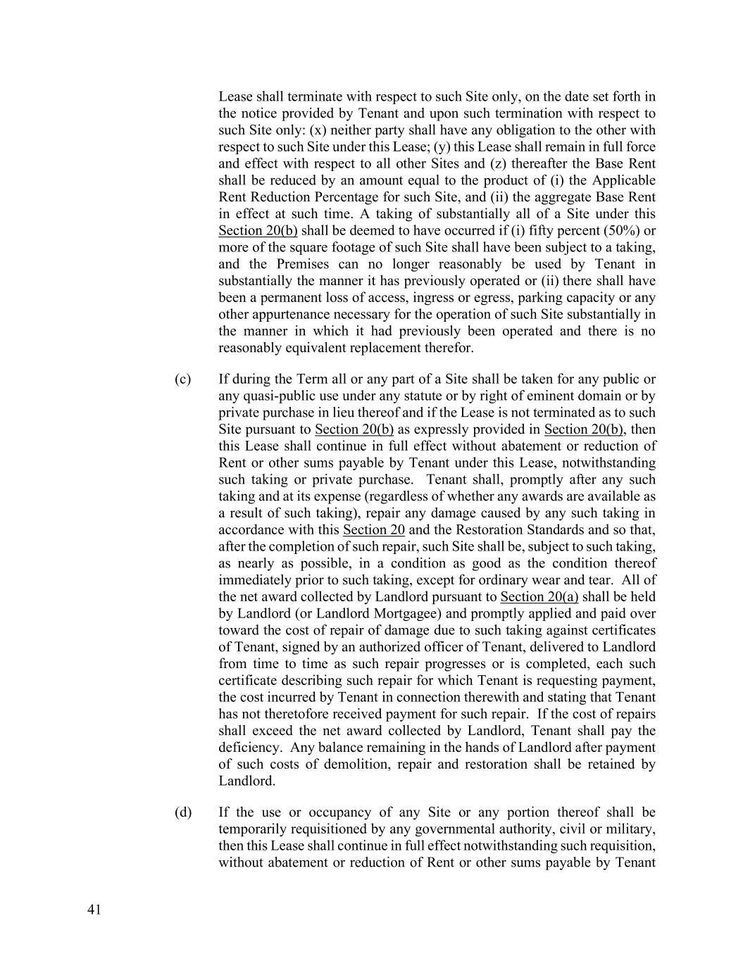 41 Lease shall terminate with respect to such Site only, on the date set forth in the notice provided by Tenant and upon such termination with respect to such Site only: (x) neither party shall have any obligation to the other with respect to such Site under this Lease; (y) this Lease shall remain in full force and effect with respect to all other Sites and (z) thereafter the Base Rent shall be reduced by an amount equal to the product of (i) the Applicable Rent Reduction Percentage for such Site, and (ii) the aggregate Base Rent in effect at such time. A taking of substantially all of a Site under this Section 20(b) shall be deemed to have occurred if (i) fifty percent (50%) or more of the square footage of such Site shall have been subject to a taking, and the Premises can no longer reasonably be used by Tenant in substantially the manner it has previously operated or (ii) there shall have been a permanent loss of access, ingress or egress, parking capacity or any other appurtenance necessary for the operation of such Site substantially in the manner in which it had previously been operated and there is no reasonably equivalent replacement therefor. (c) If during the Term all or any part of a Site shall be taken for any public or any quasi-public use under any statute or by right of eminent domain or by private purchase in lieu thereof and if the Lease is not terminated as to such Site pursuant to Section 20(b) as expressly provided in Section 20(b), then this Lease shall continue in full effect without abatement or reduction of Rent or other sums payable by Tenant under this Lease, notwithstanding such taking or private purchase. Tenant shall, promptly after any such taking and at its expense (regardless of whether any awards are available as a result of such taking), repair any damage caused by any such taking in accordance with this Section 20 and the Restoration Standards and so that, after the completion of such repair, such Site shall be, subject to such taking, as nearly as possible, in a condition as good as the condition thereof immediately prior to such taking, except for ordinary wear and tear. All of the net award collected by Landlord pursuant to Section 20(a) shall be held by Landlord (or Landlord Mortgagee) and promptly applied and paid over toward the cost of repair of damage due to such taking against certificates of Tenant, signed by an authorized officer of Tenant, delivered to Landlord from time to time as such repair progresses or is completed, each such certificate describing such repair for which Tenant is requesting payment, the cost incurred by Tenant in connection therewith and stating that Tenant has not theretofore received payment for such repair. If the cost of repairs shall exceed the net award collected by Landlord, Tenant shall pay the deficiency. Any balance remaining in the hands of Landlord after payment of such costs of demolition, repair and restoration shall be retained by Landlord. (d) If the use or occupancy of any Site or any portion thereof shall be temporarily requisitioned by any governmental authority, civil or military, then this Lease shall continue in full effect notwithstanding such requisition, without abatement or reduction of Rent or other sums payable by Tenant