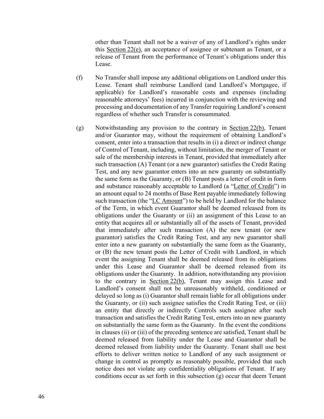 46 other than Tenant shall not be a waiver of any of Landlord’s rights under this Section 22(e), an acceptance of assignee or subtenant as Tenant, or a release of Tenant from the performance of Tenant’s obligations under this Lease. (f) No Transfer shall impose any additional obligations on Landlord under this Lease. Tenant shall reimburse Landlord (and Landlord’s Mortgagee, if applicable) for Landlord’s reasonable costs and expenses (including reasonable attorneys’ fees) incurred in conjunction with the reviewing and processing and documentation of any Transfer requiring Landlord’s consent regardless of whether such Transfer is consummated. (g) Notwithstanding any provision to the contrary in Section 22(b), Tenant and/or Guarantor may, without the requirement of obtaining Landlord’s consent, enter into a transaction that results in (i) a direct or indirect change of Control of Tenant, including, without limitation, the merger of Tenant or sale of the membership interests in Tenant, provided that immediately after such transaction (A) Tenant (or a new guarantor) satisfies the Credit Rating Test, and any new guarantor enters into an new guaranty on substantially the same form as the Guaranty, or (B) Tenant posts a letter of credit in form and substance reasonably acceptable to Landlord (a “Letter of Credit”) in an amount equal to 24 months of Base Rent payable immediately following such transaction (the “LC Amount”) to be held by Landlord for the balance of the Term, in which event Guarantor shall be deemed released from its obligations under the Guaranty or (ii) an assignment of this Lease to an entity that acquires all or substantially all of the assets of Tenant, provided that immediately after such transaction (A) the new tenant (or new guarantor) satisfies the Credit Rating Test, and any new guarantor shall enter into a new guaranty on substantially the same form as the Guaranty, or (B) the new tenant posts the Letter of Credit with Landlord, in which event the assigning Tenant shall be deemed released from its obligations under this Lease and Guarantor shall be deemed released from its obligations under the Guaranty. In addition, notwithstanding any provision to the contrary in Section 22(b), Tenant may assign this Lease and Landlord’s consent shall not be unreasonably withheld, conditioned or delayed so long as (i) Guarantor shall remain liable for all obligations under the Guaranty, or (ii) such assignee satisfies the Credit Rating Test, or (iii) an entity that directly or indirectly Controls such assignee after such transaction and satisfies the Credit Rating Test, enters into an new guaranty on substantially the same form as the Guaranty. In the event the conditions in clauses (ii) or (iii) of the preceding sentence are satisfied, Tenant shall be deemed released from liability under the Lease and Guarantor shall be deemed released from liability under the Guaranty. Tenant shall use best efforts to deliver written notice to Landlord of any such assignment or change in control as promptly as reasonably possible, provided that such notice does not violate any confidentiality obligations of Tenant. If any conditions occur as set forth in this subsection (g) occur that deem Tenant