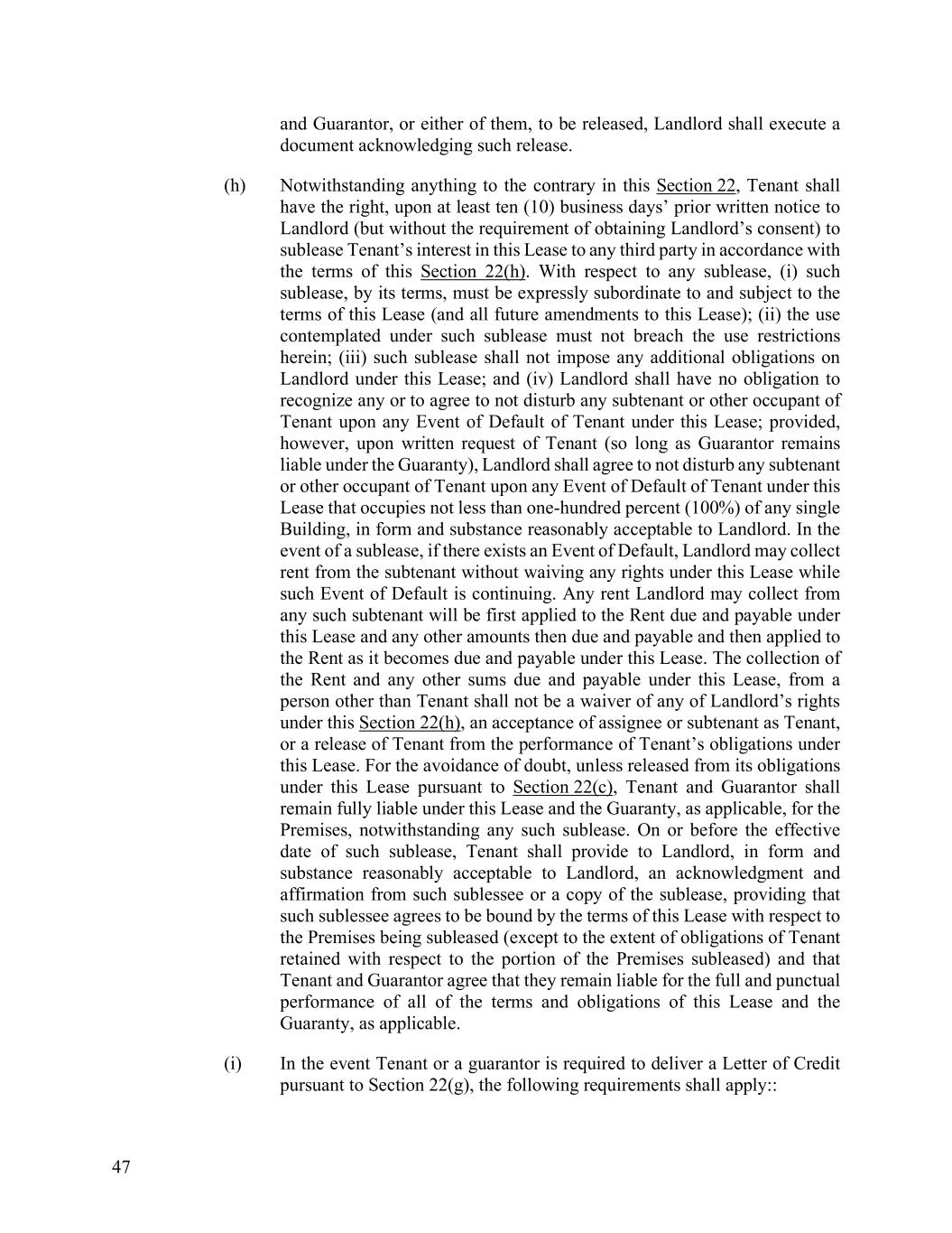47 and Guarantor, or either of them, to be released, Landlord shall execute a document acknowledging such release. (h) Notwithstanding anything to the contrary in this Section 22, Tenant shall have the right, upon at least ten (10) business days’ prior written notice to Landlord (but without the requirement of obtaining Landlord’s consent) to sublease Tenant’s interest in this Lease to any third party in accordance with the terms of this Section 22(h). With respect to any sublease, (i) such sublease, by its terms, must be expressly subordinate to and subject to the terms of this Lease (and all future amendments to this Lease); (ii) the use contemplated under such sublease must not breach the use restrictions herein; (iii) such sublease shall not impose any additional obligations on Landlord under this Lease; and (iv) Landlord shall have no obligation to recognize any or to agree to not disturb any subtenant or other occupant of Tenant upon any Event of Default of Tenant under this Lease; provided, however, upon written request of Tenant (so long as Guarantor remains liable under the Guaranty), Landlord shall agree to not disturb any subtenant or other occupant of Tenant upon any Event of Default of Tenant under this Lease that occupies not less than one-hundred percent (100%) of any single Building, in form and substance reasonably acceptable to Landlord. In the event of a sublease, if there exists an Event of Default, Landlord may collect rent from the subtenant without waiving any rights under this Lease while such Event of Default is continuing. Any rent Landlord may collect from any such subtenant will be first applied to the Rent due and payable under this Lease and any other amounts then due and payable and then applied to the Rent as it becomes due and payable under this Lease. The collection of the Rent and any other sums due and payable under this Lease, from a person other than Tenant shall not be a waiver of any of Landlord’s rights under this Section 22(h), an acceptance of assignee or subtenant as Tenant, or a release of Tenant from the performance of Tenant’s obligations under this Lease. For the avoidance of doubt, unless released from its obligations under this Lease pursuant to Section 22(c), Tenant and Guarantor shall remain fully liable under this Lease and the Guaranty, as applicable, for the Premises, notwithstanding any such sublease. On or before the effective date of such sublease, Tenant shall provide to Landlord, in form and substance reasonably acceptable to Landlord, an acknowledgment and affirmation from such sublessee or a copy of the sublease, providing that such sublessee agrees to be bound by the terms of this Lease with respect to the Premises being subleased (except to the extent of obligations of Tenant retained with respect to the portion of the Premises subleased) and that Tenant and Guarantor agree that they remain liable for the full and punctual performance of all of the terms and obligations of this Lease and the Guaranty, as applicable. (i) In the event Tenant or a guarantor is required to deliver a Letter of Credit pursuant to Section 22(g), the following requirements shall apply::
