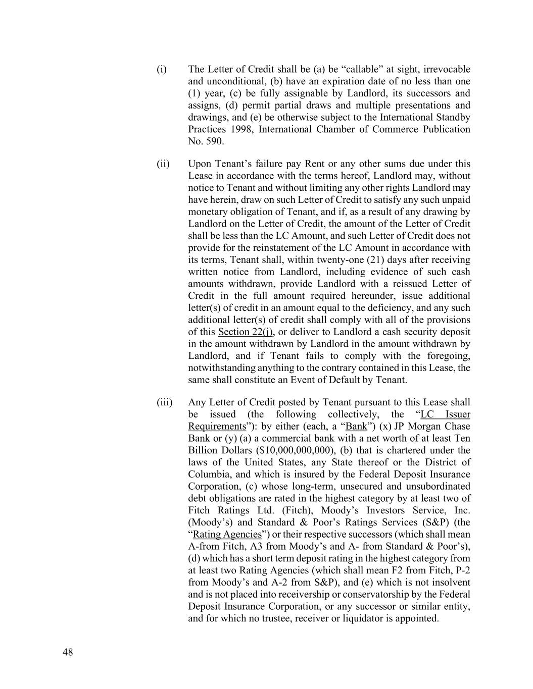 48 (i) The Letter of Credit shall be (a) be “callable” at sight, irrevocable and unconditional, (b) have an expiration date of no less than one (1) year, (c) be fully assignable by Landlord, its successors and assigns, (d) permit partial draws and multiple presentations and drawings, and (e) be otherwise subject to the International Standby Practices 1998, International Chamber of Commerce Publication No. 590. (ii) Upon Tenant’s failure pay Rent or any other sums due under this Lease in accordance with the terms hereof, Landlord may, without notice to Tenant and without limiting any other rights Landlord may have herein, draw on such Letter of Credit to satisfy any such unpaid monetary obligation of Tenant, and if, as a result of any drawing by Landlord on the Letter of Credit, the amount of the Letter of Credit shall be less than the LC Amount, and such Letter of Credit does not provide for the reinstatement of the LC Amount in accordance with its terms, Tenant shall, within twenty-one (21) days after receiving written notice from Landlord, including evidence of such cash amounts withdrawn, provide Landlord with a reissued Letter of Credit in the full amount required hereunder, issue additional letter(s) of credit in an amount equal to the deficiency, and any such additional letter(s) of credit shall comply with all of the provisions of this Section 22(j), or deliver to Landlord a cash security deposit in the amount withdrawn by Landlord in the amount withdrawn by Landlord, and if Tenant fails to comply with the foregoing, notwithstanding anything to the contrary contained in this Lease, the same shall constitute an Event of Default by Tenant. (iii) Any Letter of Credit posted by Tenant pursuant to this Lease shall be issued (the following collectively, the “LC Issuer Requirements”): by either (each, a “Bank”) (x) JP Morgan Chase Bank or (y) (a) a commercial bank with a net worth of at least Ten Billion Dollars ($10,000,000,000), (b) that is chartered under the laws of the United States, any State thereof or the District of Columbia, and which is insured by the Federal Deposit Insurance Corporation, (c) whose long-term, unsecured and unsubordinated debt obligations are rated in the highest category by at least two of Fitch Ratings Ltd. (Fitch), Moody’s Investors Service, Inc. (Moody’s) and Standard & Poor’s Ratings Services (S&P) (the “Rating Agencies”) or their respective successors (which shall mean A-from Fitch, A3 from Moody’s and A- from Standard & Poor’s), (d) which has a short term deposit rating in the highest category from at least two Rating Agencies (which shall mean F2 from Fitch, P-2 from Moody’s and A-2 from S&P), and (e) which is not insolvent and is not placed into receivership or conservatorship by the Federal Deposit Insurance Corporation, or any successor or similar entity, and for which no trustee, receiver or liquidator is appointed.