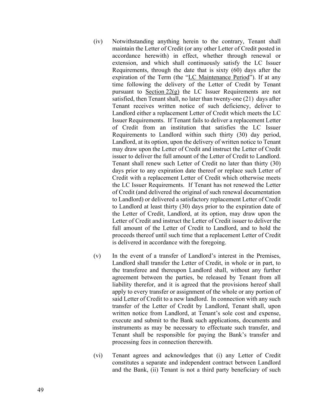 49 (iv) Notwithstanding anything herein to the contrary, Tenant shall maintain the Letter of Credit (or any other Letter of Credit posted in accordance herewith) in effect, whether through renewal or extension, and which shall continuously satisfy the LC Issuer Requirements, through the date that is sixty (60) days after the expiration of the Term (the “LC Maintenance Period”). If at any time following the delivery of the Letter of Credit by Tenant pursuant to Section 22(g) the LC Issuer Requirements are not satisfied, then Tenant shall, no later than twenty-one (21) days after Tenant receives written notice of such deficiency, deliver to Landlord either a replacement Letter of Credit which meets the LC Issuer Requirements. If Tenant fails to deliver a replacement Letter of Credit from an institution that satisfies the LC Issuer Requirements to Landlord within such thirty (30) day period, Landlord, at its option, upon the delivery of written notice to Tenant may draw upon the Letter of Credit and instruct the Letter of Credit issuer to deliver the full amount of the Letter of Credit to Landlord. Tenant shall renew such Letter of Credit no later than thirty (30) days prior to any expiration date thereof or replace such Letter of Credit with a replacement Letter of Credit which otherwise meets the LC Issuer Requirements. If Tenant has not renewed the Letter of Credit (and delivered the original of such renewal documentation to Landlord) or delivered a satisfactory replacement Letter of Credit to Landlord at least thirty (30) days prior to the expiration date of the Letter of Credit, Landlord, at its option, may draw upon the Letter of Credit and instruct the Letter of Credit issuer to deliver the full amount of the Letter of Credit to Landlord, and to hold the proceeds thereof until such time that a replacement Letter of Credit is delivered in accordance with the foregoing. (v) In the event of a transfer of Landlord’s interest in the Premises, Landlord shall transfer the Letter of Credit, in whole or in part, to the transferee and thereupon Landlord shall, without any further agreement between the parties, be released by Tenant from all liability therefor, and it is agreed that the provisions hereof shall apply to every transfer or assignment of the whole or any portion of said Letter of Credit to a new landlord. In connection with any such transfer of the Letter of Credit by Landlord, Tenant shall, upon written notice from Landlord, at Tenant’s sole cost and expense, execute and submit to the Bank such applications, documents and instruments as may be necessary to effectuate such transfer, and Tenant shall be responsible for paying the Bank’s transfer and processing fees in connection therewith. (vi) Tenant agrees and acknowledges that (i) any Letter of Credit constitutes a separate and independent contract between Landlord and the Bank, (ii) Tenant is not a third party beneficiary of such