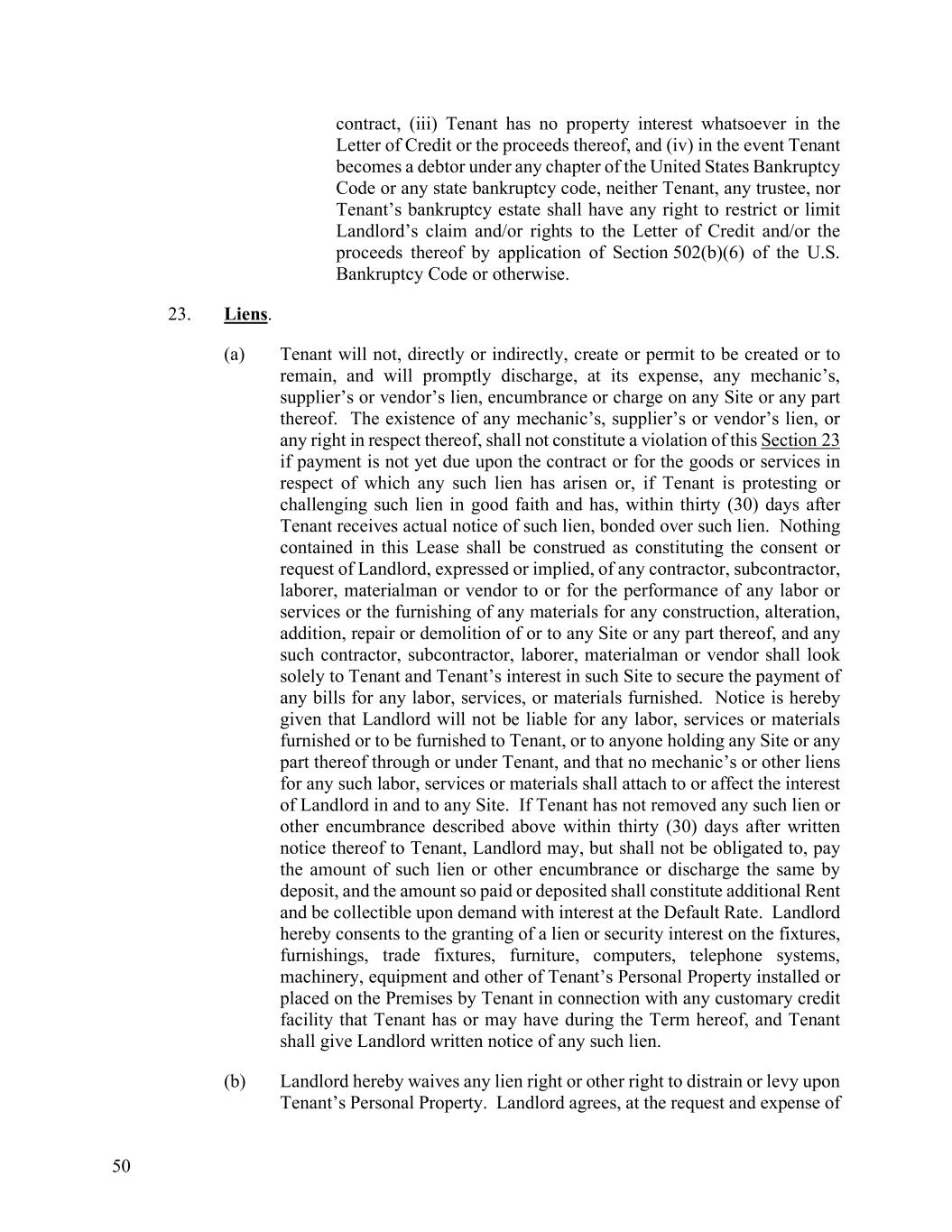 50 contract, (iii) Tenant has no property interest whatsoever in the Letter of Credit or the proceeds thereof, and (iv) in the event Tenant becomes a debtor under any chapter of the United States Bankruptcy Code or any state bankruptcy code, neither Tenant, any trustee, nor Tenant’s bankruptcy estate shall have any right to restrict or limit Landlord’s claim and/or rights to the Letter of Credit and/or the proceeds thereof by application of Section 502(b)(6) of the U.S. Bankruptcy Code or otherwise. 23. Liens. (a) Tenant will not, directly or indirectly, create or permit to be created or to remain, and will promptly discharge, at its expense, any mechanic’s, supplier’s or vendor’s lien, encumbrance or charge on any Site or any part thereof. The existence of any mechanic’s, supplier’s or vendor’s lien, or any right in respect thereof, shall not constitute a violation of this Section 23 if payment is not yet due upon the contract or for the goods or services in respect of which any such lien has arisen or, if Tenant is protesting or challenging such lien in good faith and has, within thirty (30) days after Tenant receives actual notice of such lien, bonded over such lien. Nothing contained in this Lease shall be construed as constituting the consent or request of Landlord, expressed or implied, of any contractor, subcontractor, laborer, materialman or vendor to or for the performance of any labor or services or the furnishing of any materials for any construction, alteration, addition, repair or demolition of or to any Site or any part thereof, and any such contractor, subcontractor, laborer, materialman or vendor shall look solely to Tenant and Tenant’s interest in such Site to secure the payment of any bills for any labor, services, or materials furnished. Notice is hereby given that Landlord will not be liable for any labor, services or materials furnished or to be furnished to Tenant, or to anyone holding any Site or any part thereof through or under Tenant, and that no mechanic’s or other liens for any such labor, services or materials shall attach to or affect the interest of Landlord in and to any Site. If Tenant has not removed any such lien or other encumbrance described above within thirty (30) days after written notice thereof to Tenant, Landlord may, but shall not be obligated to, pay the amount of such lien or other encumbrance or discharge the same by deposit, and the amount so paid or deposited shall constitute additional Rent and be collectible upon demand with interest at the Default Rate. Landlord hereby consents to the granting of a lien or security interest on the fixtures, furnishings, trade fixtures, furniture, computers, telephone systems, machinery, equipment and other of Tenant’s Personal Property installed or placed on the Premises by Tenant in connection with any customary credit facility that Tenant has or may have during the Term hereof, and Tenant shall give Landlord written notice of any such lien. (b) Landlord hereby waives any lien right or other right to distrain or levy upon Tenant’s Personal Property. Landlord agrees, at the request and expense of