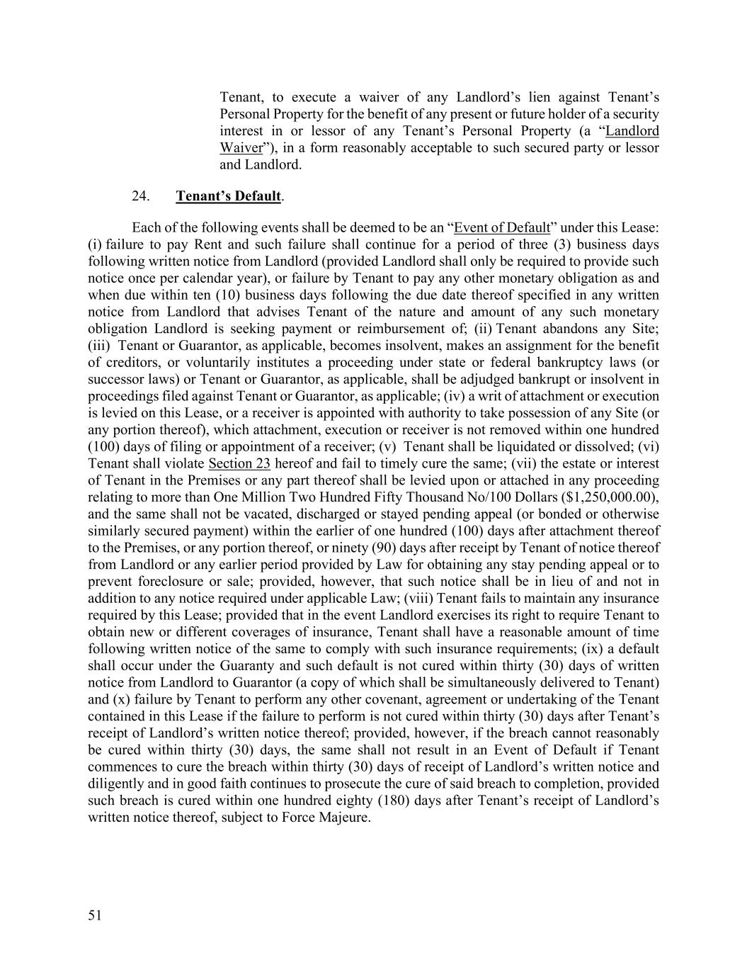 51 Tenant, to execute a waiver of any Landlord’s lien against Tenant’s Personal Property for the benefit of any present or future holder of a security interest in or lessor of any Tenant’s Personal Property (a “Landlord Waiver”), in a form reasonably acceptable to such secured party or lessor and Landlord. 24. Tenant’s Default. Each of the following events shall be deemed to be an “Event of Default” under this Lease: (i) failure to pay Rent and such failure shall continue for a period of three (3) business days following written notice from Landlord (provided Landlord shall only be required to provide such notice once per calendar year), or failure by Tenant to pay any other monetary obligation as and when due within ten (10) business days following the due date thereof specified in any written notice from Landlord that advises Tenant of the nature and amount of any such monetary obligation Landlord is seeking payment or reimbursement of; (ii) Tenant abandons any Site; (iii) Tenant or Guarantor, as applicable, becomes insolvent, makes an assignment for the benefit of creditors, or voluntarily institutes a proceeding under state or federal bankruptcy laws (or successor laws) or Tenant or Guarantor, as applicable, shall be adjudged bankrupt or insolvent in proceedings filed against Tenant or Guarantor, as applicable; (iv) a writ of attachment or execution is levied on this Lease, or a receiver is appointed with authority to take possession of any Site (or any portion thereof), which attachment, execution or receiver is not removed within one hundred (100) days of filing or appointment of a receiver; (v) Tenant shall be liquidated or dissolved; (vi) Tenant shall violate Section 23 hereof and fail to timely cure the same; (vii) the estate or interest of Tenant in the Premises or any part thereof shall be levied upon or attached in any proceeding relating to more than One Million Two Hundred Fifty Thousand No/100 Dollars ($1,250,000.00), and the same shall not be vacated, discharged or stayed pending appeal (or bonded or otherwise similarly secured payment) within the earlier of one hundred (100) days after attachment thereof to the Premises, or any portion thereof, or ninety (90) days after receipt by Tenant of notice thereof from Landlord or any earlier period provided by Law for obtaining any stay pending appeal or to prevent foreclosure or sale; provided, however, that such notice shall be in lieu of and not in addition to any notice required under applicable Law; (viii) Tenant fails to maintain any insurance required by this Lease; provided that in the event Landlord exercises its right to require Tenant to obtain new or different coverages of insurance, Tenant shall have a reasonable amount of time following written notice of the same to comply with such insurance requirements; (ix) a default shall occur under the Guaranty and such default is not cured within thirty (30) days of written notice from Landlord to Guarantor (a copy of which shall be simultaneously delivered to Tenant) and (x) failure by Tenant to perform any other covenant, agreement or undertaking of the Tenant contained in this Lease if the failure to perform is not cured within thirty (30) days after Tenant’s receipt of Landlord’s written notice thereof; provided, however, if the breach cannot reasonably be cured within thirty (30) days, the same shall not result in an Event of Default if Tenant commences to cure the breach within thirty (30) days of receipt of Landlord’s written notice and diligently and in good faith continues to prosecute the cure of said breach to completion, provided such breach is cured within one hundred eighty (180) days after Tenant’s receipt of Landlord’s written notice thereof, subject to Force Majeure.