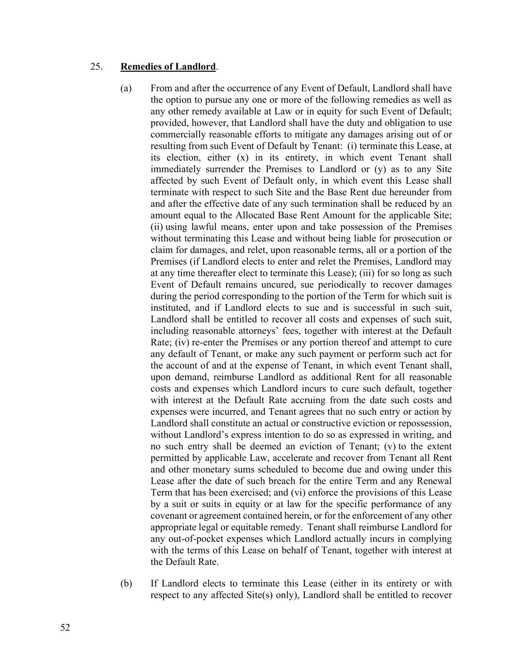 52 25. Remedies of Landlord. (a) From and after the occurrence of any Event of Default, Landlord shall have the option to pursue any one or more of the following remedies as well as any other remedy available at Law or in equity for such Event of Default; provided, however, that Landlord shall have the duty and obligation to use commercially reasonable efforts to mitigate any damages arising out of or resulting from such Event of Default by Tenant: (i) terminate this Lease, at its election, either (x) in its entirety, in which event Tenant shall immediately surrender the Premises to Landlord or (y) as to any Site affected by such Event of Default only, in which event this Lease shall terminate with respect to such Site and the Base Rent due hereunder from and after the effective date of any such termination shall be reduced by an amount equal to the Allocated Base Rent Amount for the applicable Site; (ii) using lawful means, enter upon and take possession of the Premises without terminating this Lease and without being liable for prosecution or claim for damages, and relet, upon reasonable terms, all or a portion of the Premises (if Landlord elects to enter and relet the Premises, Landlord may at any time thereafter elect to terminate this Lease); (iii) for so long as such Event of Default remains uncured, sue periodically to recover damages during the period corresponding to the portion of the Term for which suit is instituted, and if Landlord elects to sue and is successful in such suit, Landlord shall be entitled to recover all costs and expenses of such suit, including reasonable attorneys’ fees, together with interest at the Default Rate; (iv) re-enter the Premises or any portion thereof and attempt to cure any default of Tenant, or make any such payment or perform such act for the account of and at the expense of Tenant, in which event Tenant shall, upon demand, reimburse Landlord as additional Rent for all reasonable costs and expenses which Landlord incurs to cure such default, together with interest at the Default Rate accruing from the date such costs and expenses were incurred, and Tenant agrees that no such entry or action by Landlord shall constitute an actual or constructive eviction or repossession, without Landlord’s express intention to do so as expressed in writing, and no such entry shall be deemed an eviction of Tenant; (v) to the extent permitted by applicable Law, accelerate and recover from Tenant all Rent and other monetary sums scheduled to become due and owing under this Lease after the date of such breach for the entire Term and any Renewal Term that has been exercised; and (vi) enforce the provisions of this Lease by a suit or suits in equity or at law for the specific performance of any covenant or agreement contained herein, or for the enforcement of any other appropriate legal or equitable remedy. Tenant shall reimburse Landlord for any out-of-pocket expenses which Landlord actually incurs in complying with the terms of this Lease on behalf of Tenant, together with interest at the Default Rate. (b) If Landlord elects to terminate this Lease (either in its entirety or with respect to any affected Site(s) only), Landlord shall be entitled to recover