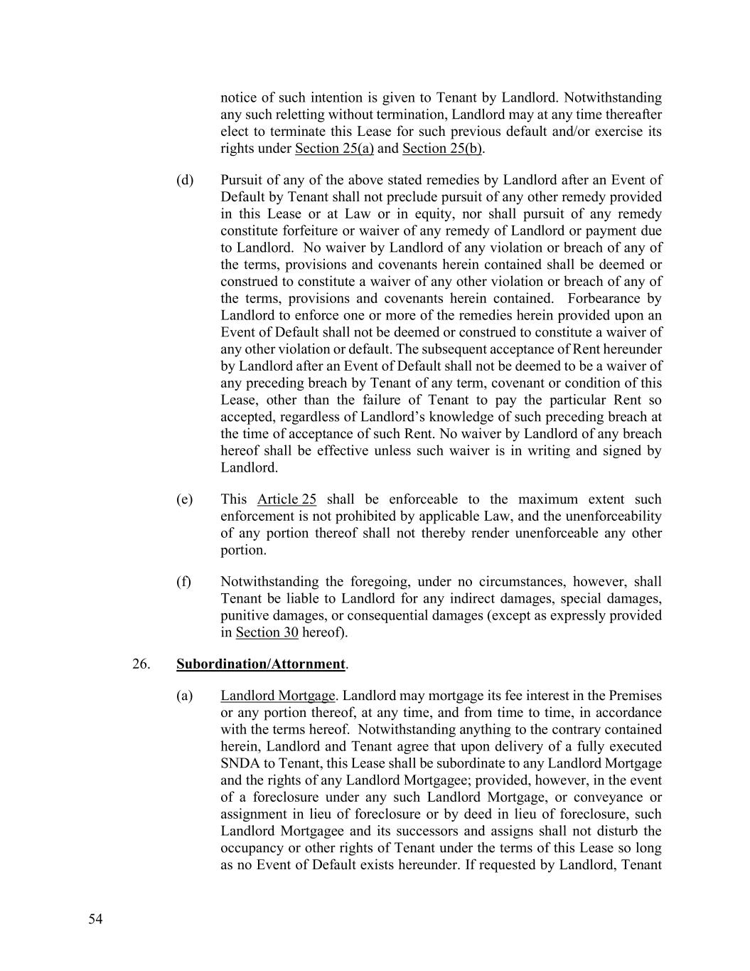 54 notice of such intention is given to Tenant by Landlord. Notwithstanding any such reletting without termination, Landlord may at any time thereafter elect to terminate this Lease for such previous default and/or exercise its rights under Section 25(a) and Section 25(b). (d) Pursuit of any of the above stated remedies by Landlord after an Event of Default by Tenant shall not preclude pursuit of any other remedy provided in this Lease or at Law or in equity, nor shall pursuit of any remedy constitute forfeiture or waiver of any remedy of Landlord or payment due to Landlord. No waiver by Landlord of any violation or breach of any of the terms, provisions and covenants herein contained shall be deemed or construed to constitute a waiver of any other violation or breach of any of the terms, provisions and covenants herein contained. Forbearance by Landlord to enforce one or more of the remedies herein provided upon an Event of Default shall not be deemed or construed to constitute a waiver of any other violation or default. The subsequent acceptance of Rent hereunder by Landlord after an Event of Default shall not be deemed to be a waiver of any preceding breach by Tenant of any term, covenant or condition of this Lease, other than the failure of Tenant to pay the particular Rent so accepted, regardless of Landlord’s knowledge of such preceding breach at the time of acceptance of such Rent. No waiver by Landlord of any breach hereof shall be effective unless such waiver is in writing and signed by Landlord. (e) This Article 25 shall be enforceable to the maximum extent such enforcement is not prohibited by applicable Law, and the unenforceability of any portion thereof shall not thereby render unenforceable any other portion. (f) Notwithstanding the foregoing, under no circumstances, however, shall Tenant be liable to Landlord for any indirect damages, special damages, punitive damages, or consequential damages (except as expressly provided in Section 30 hereof). 26. Subordination/Attornment. (a) Landlord Mortgage. Landlord may mortgage its fee interest in the Premises or any portion thereof, at any time, and from time to time, in accordance with the terms hereof. Notwithstanding anything to the contrary contained herein, Landlord and Tenant agree that upon delivery of a fully executed SNDA to Tenant, this Lease shall be subordinate to any Landlord Mortgage and the rights of any Landlord Mortgagee; provided, however, in the event of a foreclosure under any such Landlord Mortgage, or conveyance or assignment in lieu of foreclosure or by deed in lieu of foreclosure, such Landlord Mortgagee and its successors and assigns shall not disturb the occupancy or other rights of Tenant under the terms of this Lease so long as no Event of Default exists hereunder. If requested by Landlord, Tenant