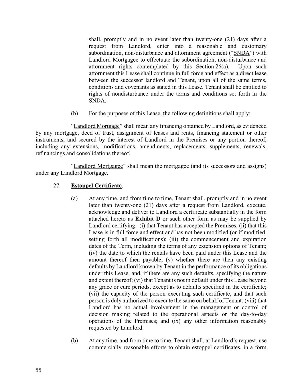55 shall, promptly and in no event later than twenty-one (21) days after a request from Landlord, enter into a reasonable and customary subordination, non-disturbance and attornment agreement (“SNDA”) with Landlord Mortgagee to effectuate the subordination, non-disturbance and attornment rights contemplated by this Section 26(a). Upon such attornment this Lease shall continue in full force and effect as a direct lease between the successor landlord and Tenant, upon all of the same terms, conditions and covenants as stated in this Lease. Tenant shall be entitled to rights of nondisturbance under the terms and conditions set forth in the SNDA. (b) For the purposes of this Lease, the following definitions shall apply: “Landlord Mortgage” shall mean any financing obtained by Landlord, as evidenced by any mortgage, deed of trust, assignment of leases and rents, financing statement or other instruments, and secured by the interest of Landlord in the Premises or any portion thereof, including any extensions, modifications, amendments, replacements, supplements, renewals, refinancings and consolidations thereof. “Landlord Mortgagee” shall mean the mortgagee (and its successors and assigns) under any Landlord Mortgage. 27. Estoppel Certificate. (a) At any time, and from time to time, Tenant shall, promptly and in no event later than twenty-one (21) days after a request from Landlord, execute, acknowledge and deliver to Landlord a certificate substantially in the form attached hereto as Exhibit D or such other form as may be supplied by Landlord certifying: (i) that Tenant has accepted the Premises; (ii) that this Lease is in full force and effect and has not been modified (or if modified, setting forth all modifications); (iii) the commencement and expiration dates of the Term, including the terms of any extension options of Tenant; (iv) the date to which the rentals have been paid under this Lease and the amount thereof then payable; (v) whether there are then any existing defaults by Landlord known by Tenant in the performance of its obligations under this Lease, and, if there are any such defaults, specifying the nature and extent thereof; (vi) that Tenant is not in default under this Lease beyond any grace or cure periods, except as to defaults specified in the certificate; (vii) the capacity of the person executing such certificate, and that such person is duly authorized to execute the same on behalf of Tenant; (viii) that Landlord has no actual involvement in the management or control of decision making related to the operational aspects or the day-to-day operations of the Premises; and (ix) any other information reasonably requested by Landlord. (b) At any time, and from time to time, Tenant shall, at Landlord’s request, use commercially reasonable efforts to obtain estoppel certificates, in a form