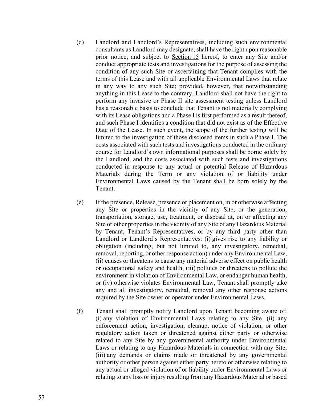 57 (d) Landlord and Landlord’s Representatives, including such environmental consultants as Landlord may designate, shall have the right upon reasonable prior notice, and subject to Section 15 hereof, to enter any Site and/or conduct appropriate tests and investigations for the purpose of assessing the condition of any such Site or ascertaining that Tenant complies with the terms of this Lease and with all applicable Environmental Laws that relate in any way to any such Site; provided, however, that notwithstanding anything in this Lease to the contrary, Landlord shall not have the right to perform any invasive or Phase II site assessment testing unless Landlord has a reasonable basis to conclude that Tenant is not materially complying with its Lease obligations and a Phase I is first performed as a result thereof, and such Phase I identifies a condition that did not exist as of the Effective Date of the Lease. In such event, the scope of the further testing will be limited to the investigation of those disclosed items in such a Phase I. The costs associated with such tests and investigations conducted in the ordinary course for Landlord’s own informational purposes shall be borne solely by the Landlord, and the costs associated with such tests and investigations conducted in response to any actual or potential Release of Hazardous Materials during the Term or any violation of or liability under Environmental Laws caused by the Tenant shall be born solely by the Tenant. (e) If the presence, Release, presence or placement on, in or otherwise affecting any Site or properties in the vicinity of any Site, or the generation, transportation, storage, use, treatment, or disposal at, on or affecting any Site or other properties in the vicinity of any Site of any Hazardous Material by Tenant, Tenant’s Representatives, or by any third party other than Landlord or Landlord’s Representatives: (i) gives rise to any liability or obligation (including, but not limited to, any investigatory, remedial, removal, reporting, or other response action) under any Environmental Law, (ii) causes or threatens to cause any material adverse effect on public health or occupational safety and health, (iii) pollutes or threatens to pollute the environment in violation of Environmental Law, or endanger human health, or (iv) otherwise violates Environmental Law, Tenant shall promptly take any and all investigatory, remedial, removal any other response actions required by the Site owner or operator under Environmental Laws. (f) Tenant shall promptly notify Landlord upon Tenant becoming aware of: (i) any violation of Environmental Laws relating to any Site, (ii) any enforcement action, investigation, cleanup, notice of violation, or other regulatory action taken or threatened against either party or otherwise related to any Site by any governmental authority under Environmental Laws or relating to any Hazardous Materials in connection with any Site, (iii) any demands or claims made or threatened by any governmental authority or other person against either party hereto or otherwise relating to any actual or alleged violation of or liability under Environmental Laws or relating to any loss or injury resulting from any Hazardous Material or based